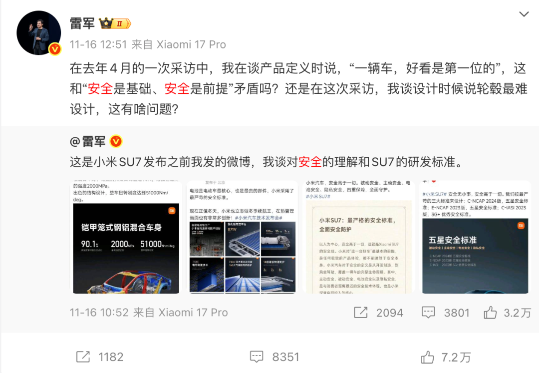 随后,有网友发现,2024年4月,接受媒体人李翔采访时,雷军谈及小米汽车的产品理念称“一辆车,好看是第一位的”,因而质疑小米汽车重颜值轻安全。