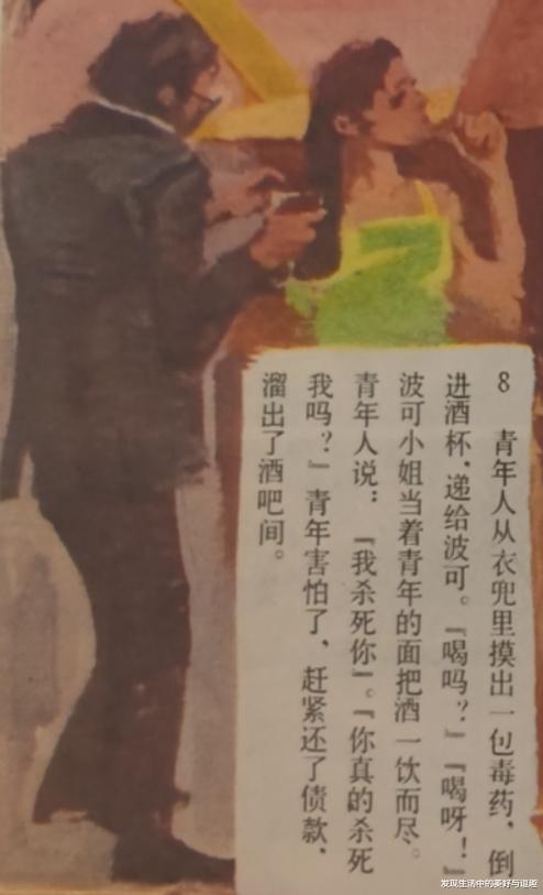 青年人从衣兜里摸出一包毒药,倒进酒杯,递给波可。 “喝吗?” “喝呀。”波可小姐当着青年的面把酒一饮而尽,青年人害怕了,赶紧还了债款溜出了酒吧间。