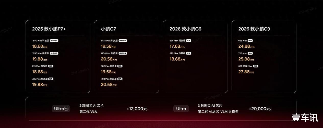 【2026年1月8日,广州】 今日,在2026小鹏全球新品发布会上,小鹏汽车正式发布2026 款小鹏 P7+、小鹏 G7 超级增程、2026 款小鹏 G6、2026 款小鹏 G9。其中2026款小鹏P7+ 全球36国同步发布,新车有超级增程和纯电两种能源形式,超级增程有1550 Max 科技版和1550 Max 旗舰版,官方指导售价为18.68万元和19.88万元;纯电有615 Max旗舰版和725 Max 旗舰版,官方指导售价为18.68万元和19.88万元。2026款小鹏G7推出四个版本,超级增程1704 Max 科技版和1704 Max 旗舰版,官方指导售价为19.58万元和20.58万元;纯电602 Max 旗舰版和702 Max 旗舰版,官方指导售价为19.58万元和20.58万元。2026 款小鹏 G6推出纯电625 Max 科技版和625 Max 旗舰版,官方指导售价为17.68万元和18.68万元。2026 款小鹏 G9推出纯电625Max、725 Max和680 四驱Max版,官方指导售价为24.88万元、25.88万元和27.88万元。