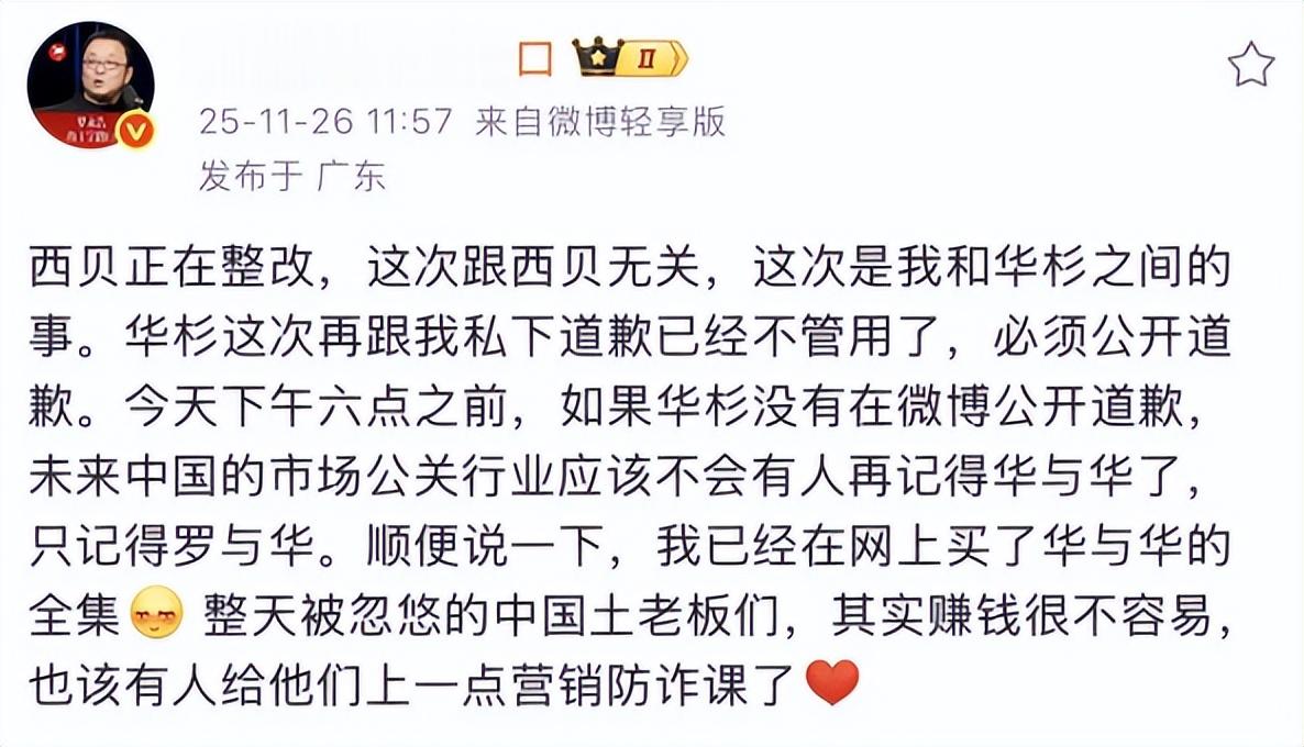 但华彬真的是惹错人了,罗永浩已经宣战了,今天6点前,华彬必须公开道歉,否则就要揭华与华的老底,让它消失。