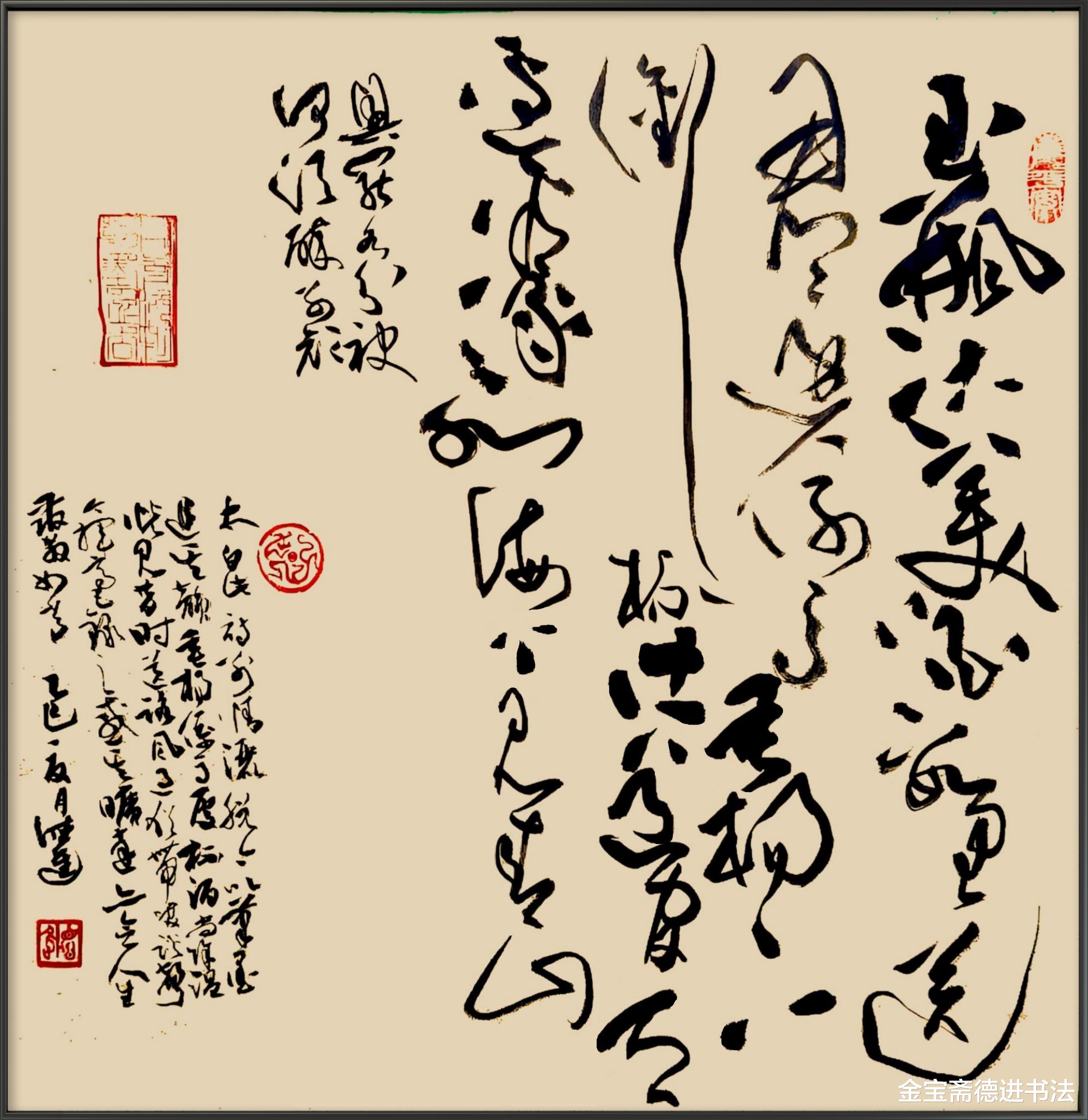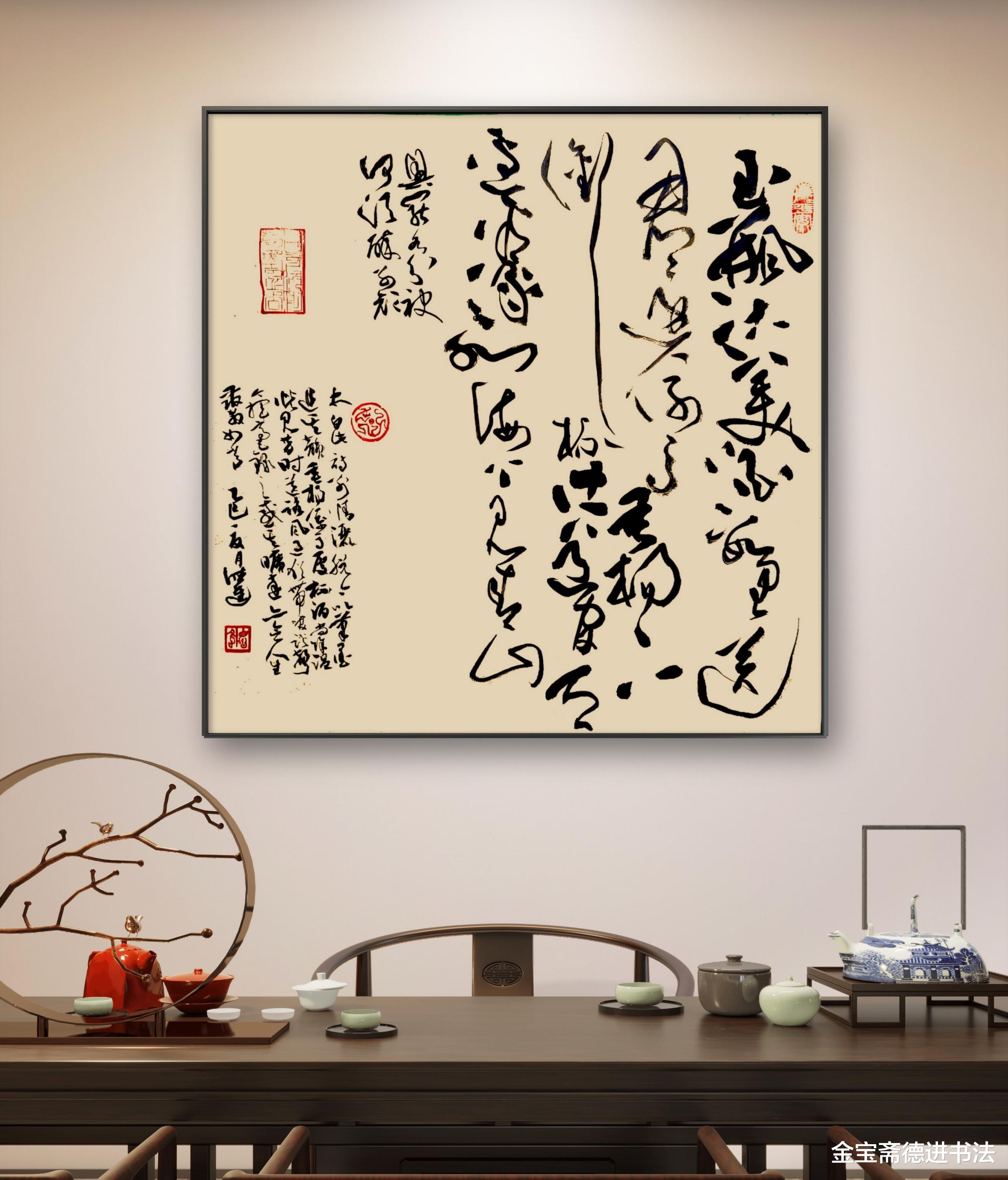 斗方形制方正小巧,与茶室的雅致格局相融,不会喧宾夺主,反而如一方雅致的画眼,点亮墙面。草书的笔势连绵缠绕、纵横捭阖,笔墨的浓淡枯湿间,藏着线条的张力与韵律 —— 牵丝映带如茶烟袅袅,豪放笔触似酒意酣然,将李白送别友人时的洒脱心境,化作跃然纸上的动感。