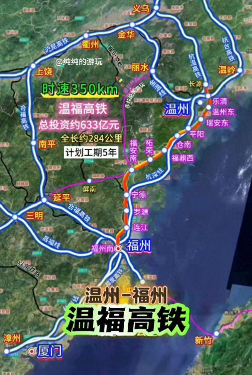 · 项目正线长约302公里,设计时速350公里,建设工期约5年,计划于2030年建成通车。届时,温州至福州的通行时间将缩短至约1小时。