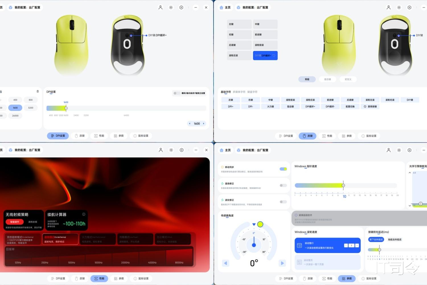 底部有一个开关键和一个DIY独立键,支持功能自定义,可以设置切换回报率参数模式、DPI等功能,而且所有的按键都可以通过驱动进行自定义设置。大面积的特氟龙材质脚贴,滑动更顺滑更稳定。可替换底盖设计没有缺席,可使用触底充电底座给鼠标充电。底盖内是磁吸设计的接收器收纳仓。