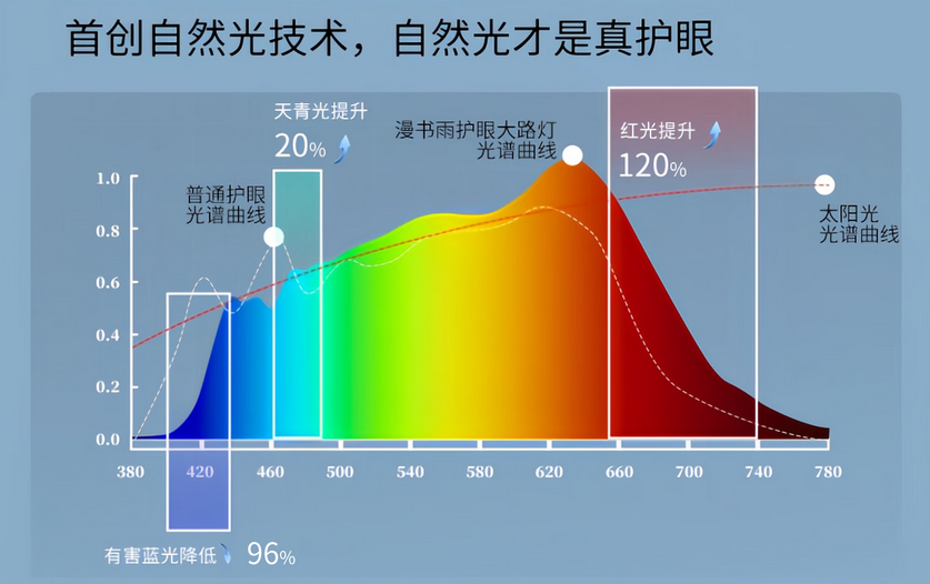 光源技术采用首尔高品质灯珠,搭配科学光配方,自然光拟合度95%,有害蓝光峰值低,蓝绿光波段充足,实验室验证能显著提升专注力,在减缓近视发展方面发挥重要作用。