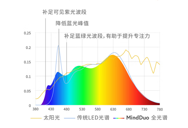 日常娱乐模式:模拟户外12点的高亮光谱图,无暗区照明,让眼睛更舒服;