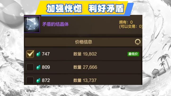 而加强恍惚套的最好方式,大幅提升增幅12的额外属性,让氪佬更愿意去增幅!这样矛盾的价格才会起飞,普通玩家也高兴啊!比如矛盾涨回1000,那每周搬砖都会多给几万泰拉呢。