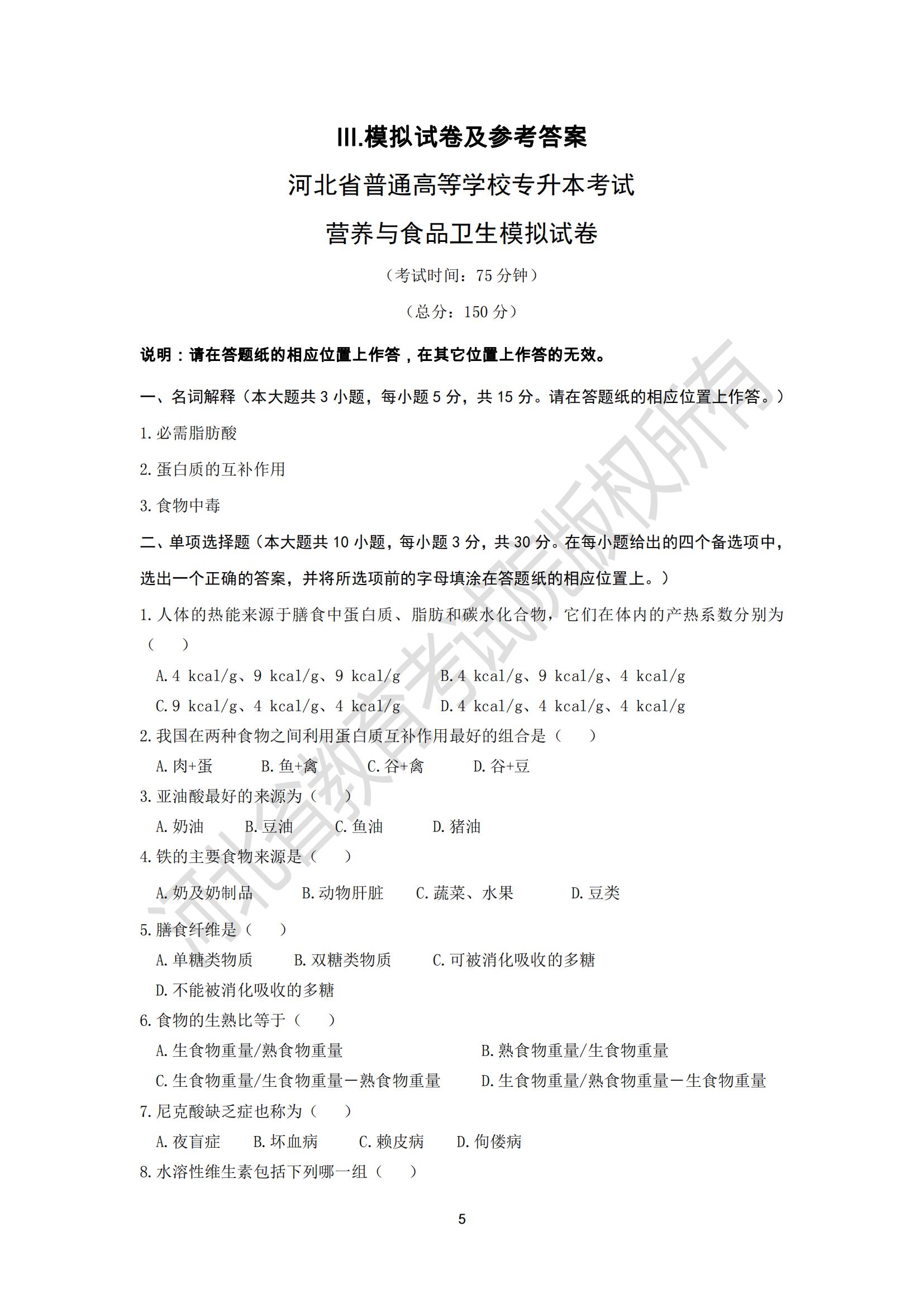 河北省普通高等学校专升本考试营养与食品卫生模拟试卷(考试时间:75 分钟)(总分:150 分)说明:请在答题纸的相应位置上作答,在其它位置上作答的无效。