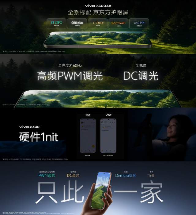 此次vivo X300系列全系搭载京东方Q10 Plus护眼屏,将舒适观感提升到了新高度。这块屏幕不仅采用8T LTPO技术,实现高刷与低功耗的平衡,更在护眼方面做到了行业领先。它首次实现全亮度同时支持DC调光和2160Hz高频PWM调光,从源头降低频闪,有效缓解长时间观看带来的视觉疲劳。配合双Demura优化与硬件级1nit极暗屏,无论是强光下还是暗光环境,都能呈现清晰、柔和、舒适的视觉体验,真正做到了“出彩护眼”。