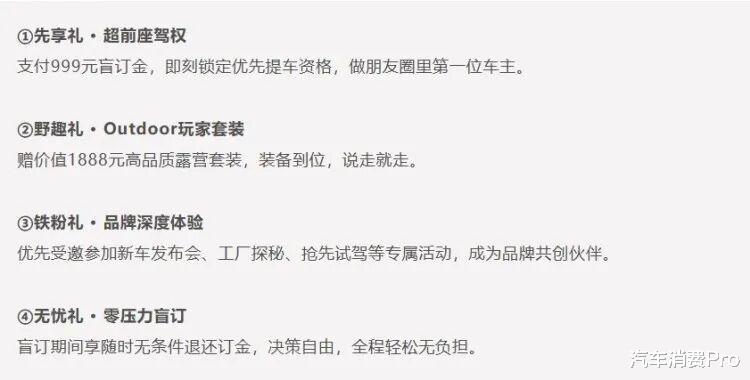 对于订车用户,可享受四重福利,包括优先提车、赠送价值1888元露营套装、优先受邀参加车企活动/共创伙伴、盲订期间订金随时可退,具体看下图。