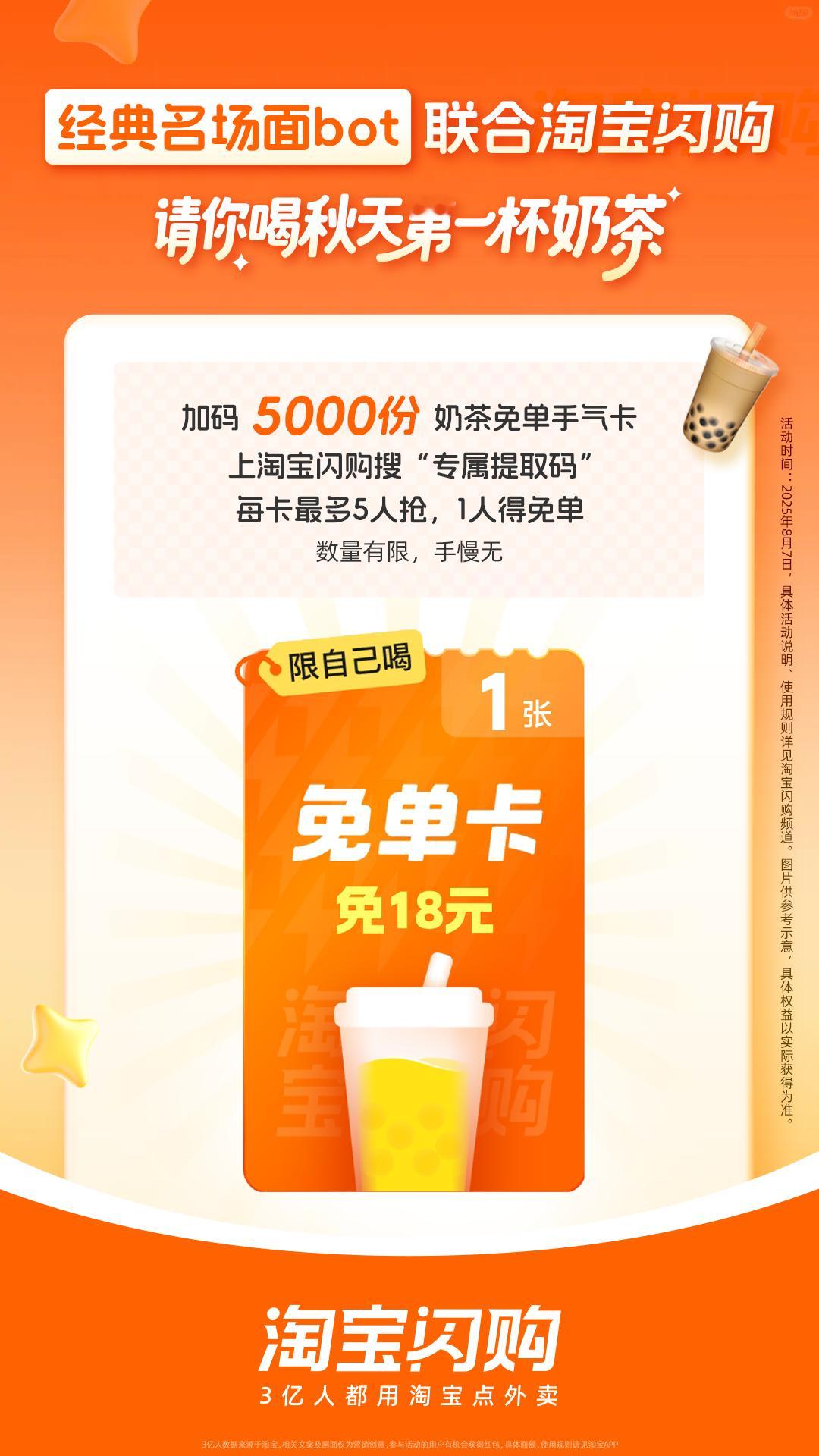 没想到淘宝闪购的名场面还是吹到了自己头上,秋天的第一杯奶茶喝!怎么能不喝!请!怎么能不请!我和一起请大家喝秋天的第一杯奶茶!为大家加码5000份奶茶免单手气卡,现在速上淘宝闪购搜我的专属提取码【03229Z 】抢奶茶免单手气卡,单张手气卡可有5人参与,必有1人中免单!