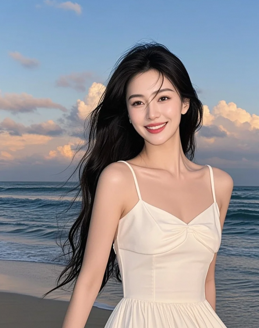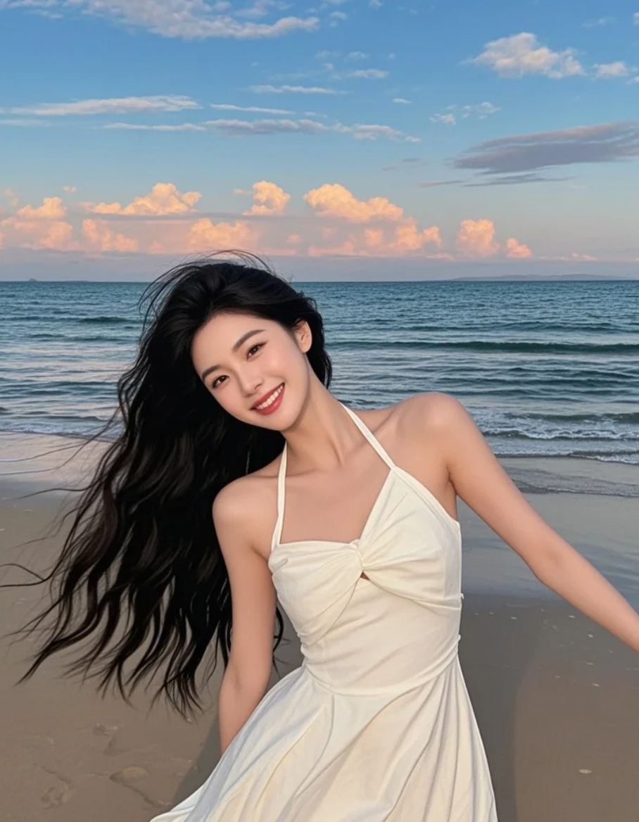 沙粒沾在脚踝,长发垂落,白裙轻拂