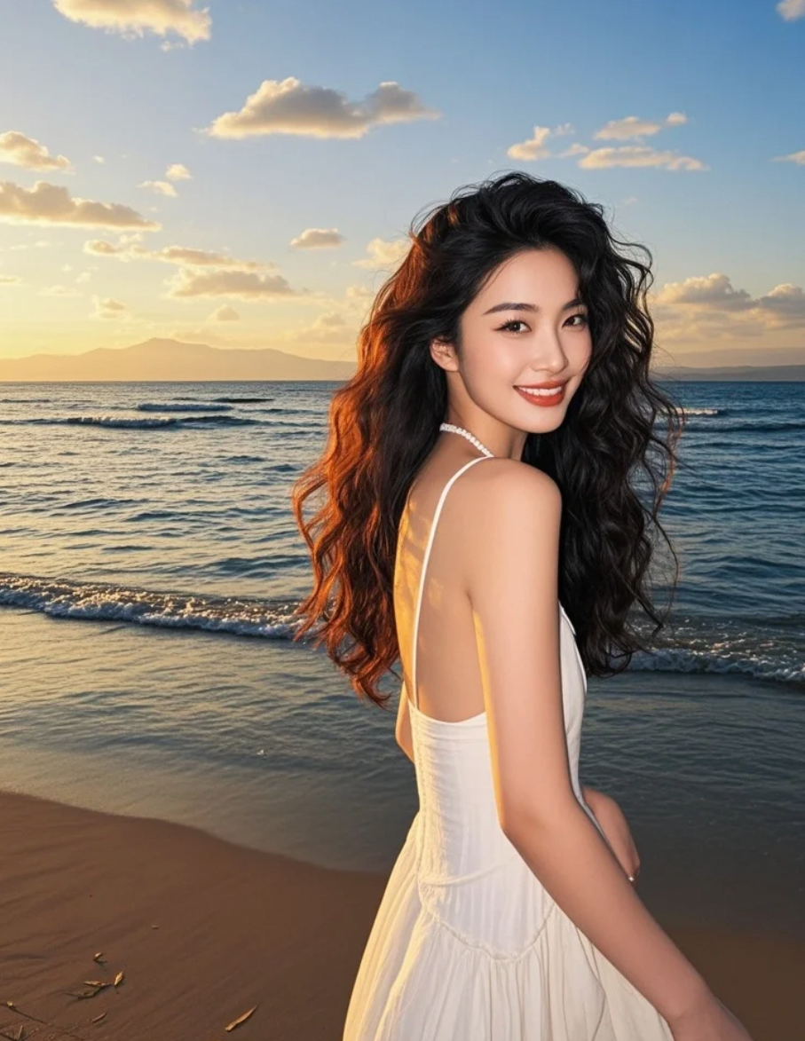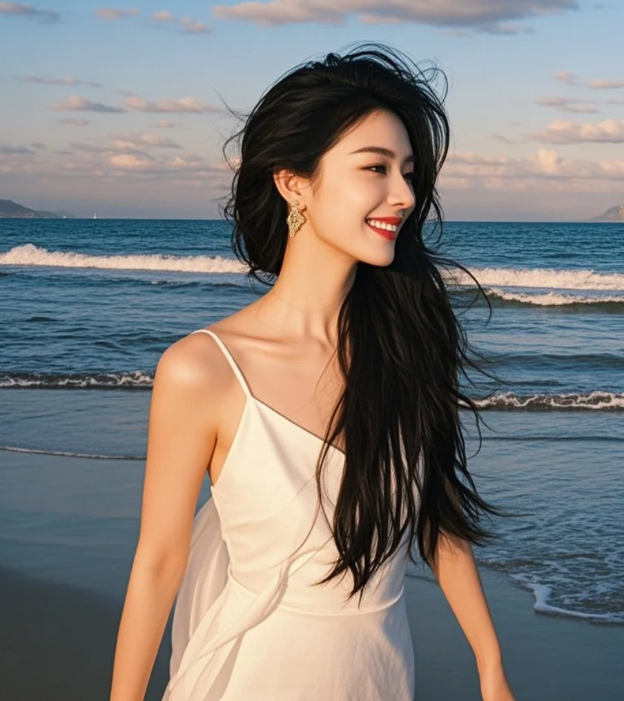 白裙掠过沙滩,留下风驰电掣的痕迹