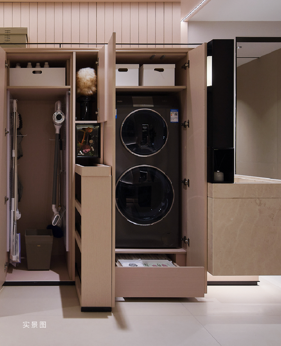 家政清洁仓与厨房的升级更显人性化:前者将清洁工具、洗衣机等“藏于无形”,后者通过“一家之煮”与“副厨中心”的分区设计,让烹饪从任务变为享受——无论是亲友小聚的热闹,还是亲子协作的温馨,都能在此从容上演。