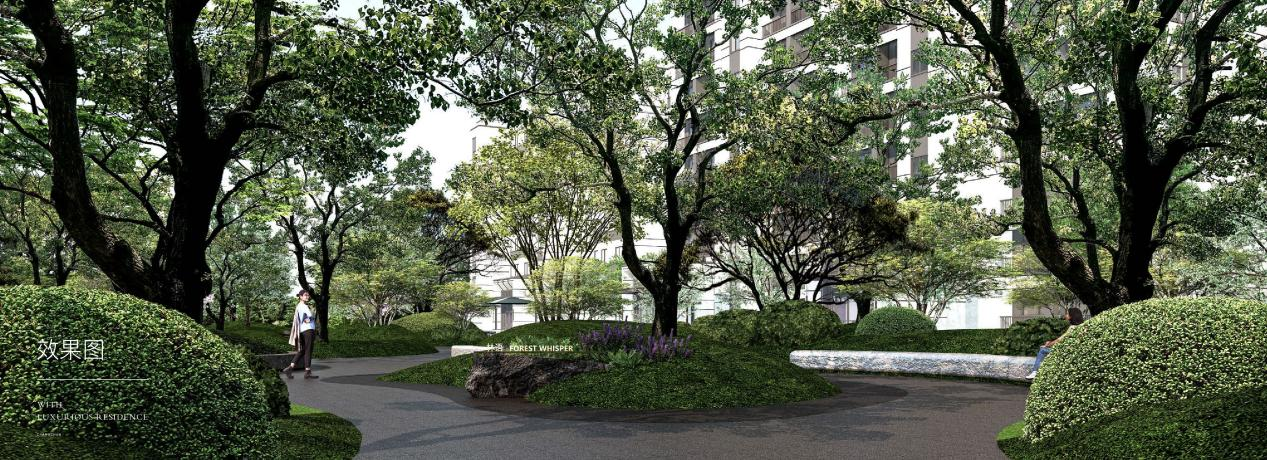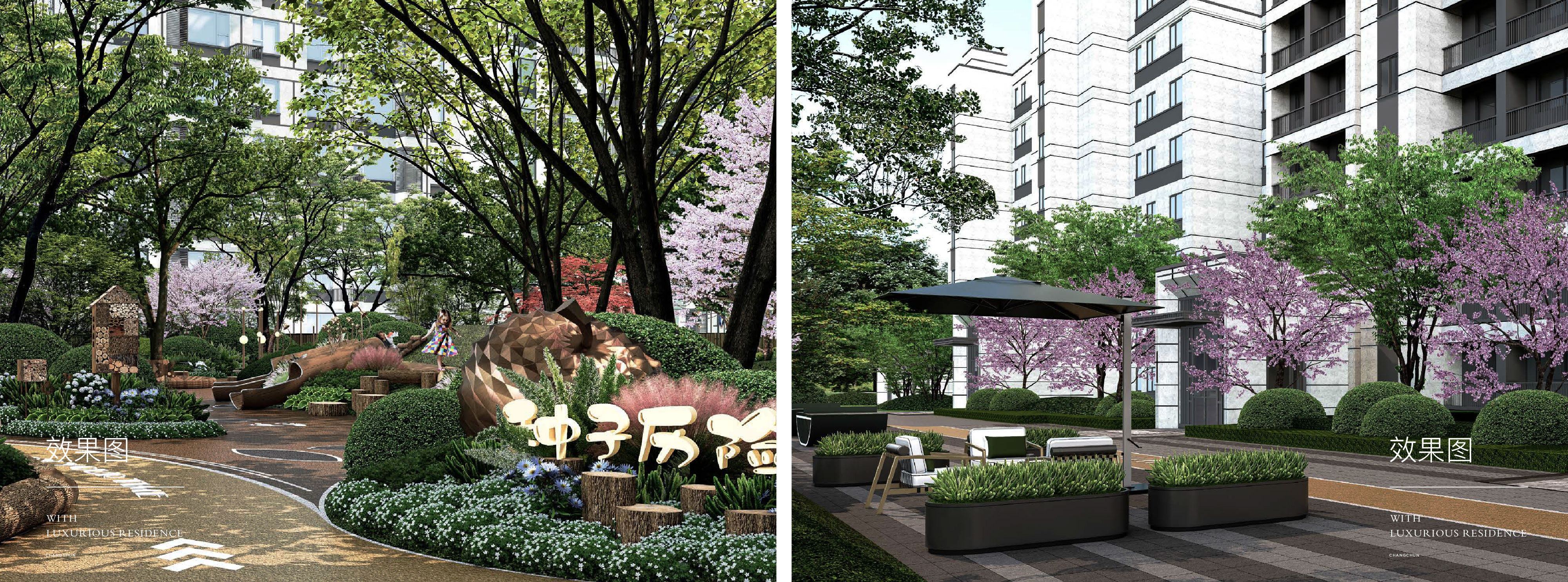 2.2期园林在一期一环三轴八景之上,以“自然疗愈”为核心,打造复合型林间会客厅。区别于传统景观的观赏性,这里更强调功能与自然的融合——阅读区嵌入树荫之下,健身区环绕绿植而生,让业主在翻阅书页或舒展肢体时,随时感受林风拂面的惬意。