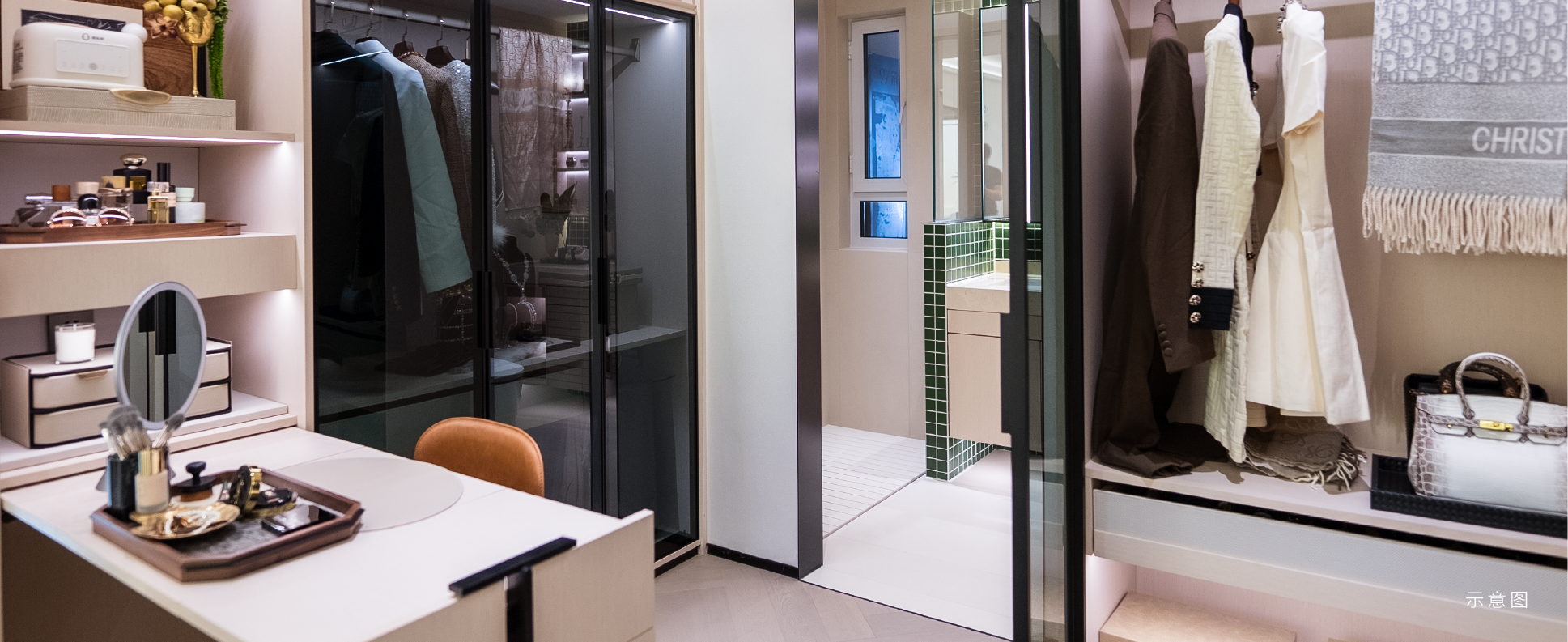 值得一提的是新增的女王衣橱和家政清洁仓,让小空间也有大作为!女王衣橱打造私密更衣空间,兼顾首饰收纳与简约挂衣,让穿搭从容优雅;家政清洁仓将清洁工具、洗衣机等巧妙隐藏,既节省空间又保持室内整洁,让两居室的生活更显从容有序,尽显顶配改善的品质感。