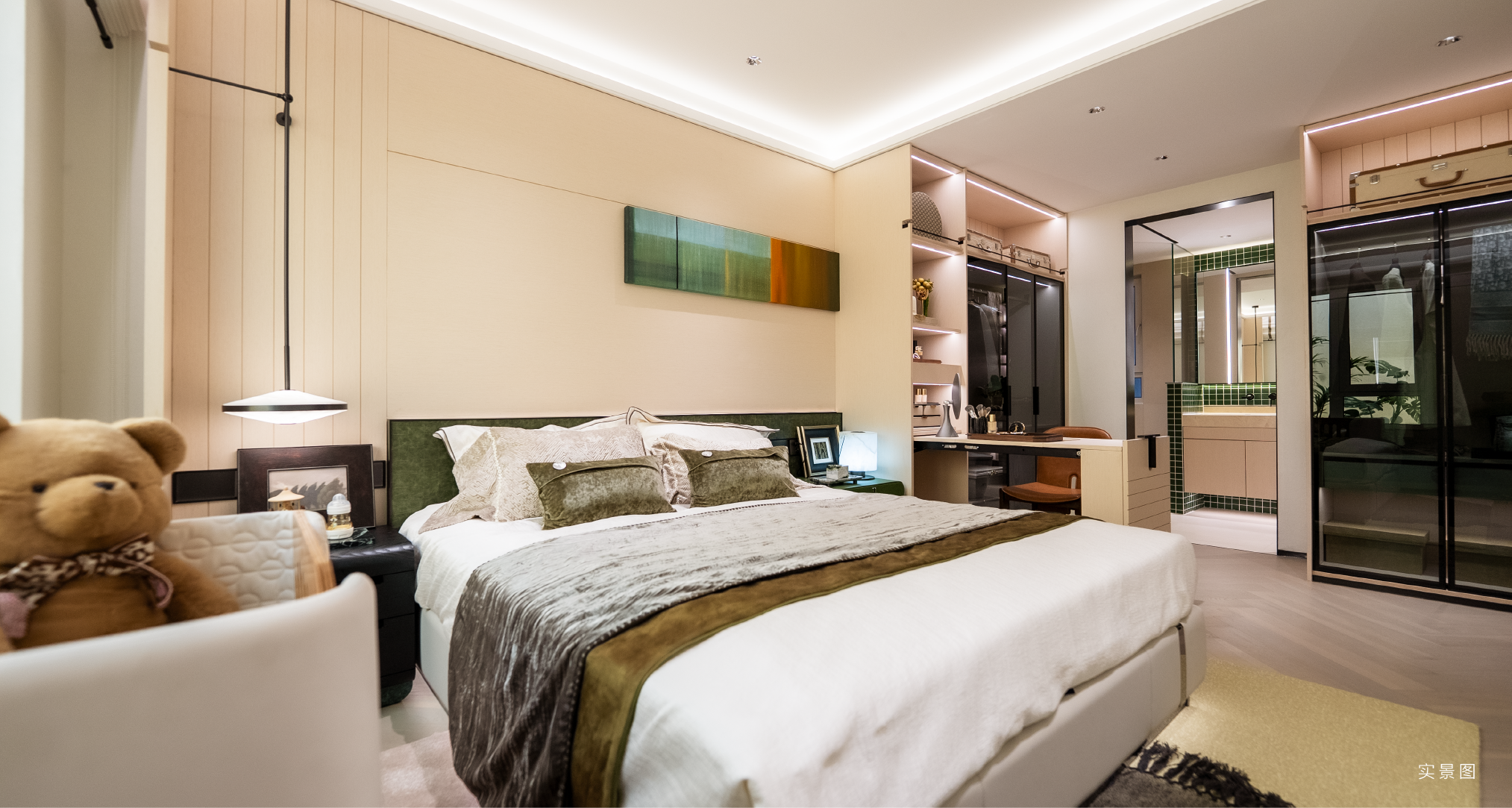 主卧以“小家化”理念重构私密空间:亲子照料角、明亮梳妆区、女王衣橱与一米水吧的组合,满足从日常休憩到精致生活的全需求。