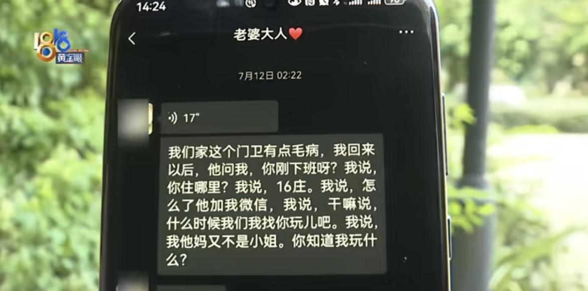 浙江杭州,女子加班到凌晨下班,到家都2点多了,在经过小区门口时保安竟出言调戏:美女这么晚,出来耍一下?女子很不爽,没有搭理保安。两天后女子又加班到深夜,上次的保安发现后又出言调戏,这次女子没有惯着,拿出手机录像后,骂了他几句后径直离开。女子丈夫得知后又惊又怕,因为女子已有身孕,次日报警后找到物业讨说法,物业查明情况后表示7月底就会开除保安,可现在都8月中旬了,保安还在那上班。 “美女啊,要不要玩一下?” 8月25号,据1818黄金眼报道,一名怀孕2个月的孕妇在凌晨回家时,竟连续两次被小区保安言语骚扰! 这名怀孕两个月的女业主,是小张的妻子,她因为岗位性质,经常需要值夜班。 经常凌晨两三点,才会回小区。 小张一直觉得小区环境不错,保安也是尽心尽责,白天遇见保安时,保安都是笑眯眯的。 几天前的一个深夜,小张的妻子独自走在回家的路上,手里提着工作包,脚步因疲惫而略显沉重。 就在她刚踏进小区大门的瞬间,一名约四十多岁的中年保安缓缓走了过来,神情带着几分轻佻和不耐烦。 保安开口搭讪,先是询问女子住哪栋楼,语气中带着审视和探查的意味。 随后,他主动要求加微信,眼神里闪烁着不合时宜的笑意,动作轻浮,让女子感到明显的不适感。 女子整日奔波劳累,只想快点回家休息,可这一连串挑衅式的言语让她心头涌起不安与愤怒。 最让她愤怒的是,当保安轻佻地问出“要不要玩一下?”时,她整个人一愣,愤慨之情瞬间涌上心头。 她强忍着惊讶与不适,愤怒回击:“我又不是小姐,你玩什么?你说话给我注意点!” 保安显然没有预料到女子会如此直接反驳,愣了一下,随即神色略显不悦,但仍试图用轻佻的语气化解尴尬。 女子赶紧快步走向自家楼道,心中既气愤又心慌。 回到家后,她立即将事情告诉了丈夫小张。 小张听后,拳头紧握,愤怒不已,意识到保安的行为不仅言语猥亵,更对妻子的人身安全造成了潜在威胁。 随后,小张决定向物业投诉。 没想到,这起事件不仅没有迅速平息,仅仅过了两天,小张妻子又被调戏了。 又是凌晨下班后,女子再次遇到了那个保安。 他依然在小区门口凑上来搭话,再次出言调戏:“美女好巧又见面了,出来耍下不?”甚至还追了上来。 这次,女子感到极度害怕,她意识到保安是故意的,并且似乎盯上了她。 她无法再忍受这种蓄意的骚扰,立刻用手机录下了视频,并第一时间通知了丈夫。 小张很快赶到,先扶妻子回家,得知妻子怀孕后遭遇如此侵犯,他更是“又惊又怕”,彻底爆发了。 他认为保安不仅没有保护业主,反而连续两次进行骚扰,这让他无法接受。 第二天,小张当即报警,并找到物业办公室讨要说法。 物业最初的态度很好,承诺会严肃处理,表示一定会辞退涉事保安。 可是,物业的承诺却迟迟未能兑现。 等了几天,甚至半个月后,那个保安竟然仍在小区内执勤。 物业负责人调出监控,却以只有录像无声音为由,称“无法确定具体情况”,试图和稀泥。 保安本人则辩解称是和李女士开玩笑,并无恶意,小张拿出手机录像,怒斥保安“龌龊的想法”,质问“我们和你熟吗就开玩笑?” 物业最终无法赖账,表示最迟七月底就会开除涉事保安。 但很快到了月底,保安依然在岗,物业又解释说“人员紧张”,要等新保安上岗才能开除。 又过了十天,那个保安竟然还在小区里,面对物业的敷衍和拖延,小张感到更加生气,他决定不再坐等,而是采取更强硬的措施。 他联系了媒体,将此事曝光给1818黄金眼,事件迅速引起了公众的广泛关注。 在舆论的巨大压力下,物业负责人终于出面回应。 他解释说,涉事保安是第三方公司管理的人员,但已经被正式开除,不日将离开小区。 这起事件在网络上引发了热议,许多人建议将此类保安拉入黑名单,避免他们去其他小区继续作案,危害更多居民。 “这就是物业公司的保安?业主每月被索取物业费,停车费,养着这帮吸血鬼,难道还要接受流氓保安的调戏?实在是太过分了。” 对此,你怎么看?
