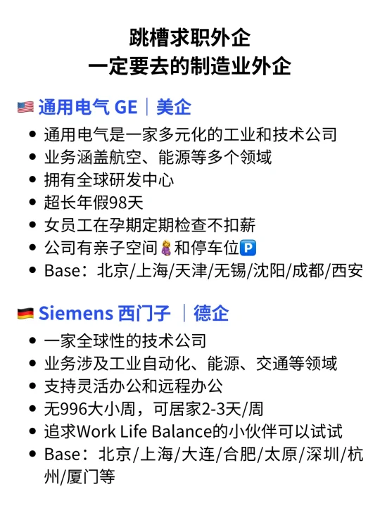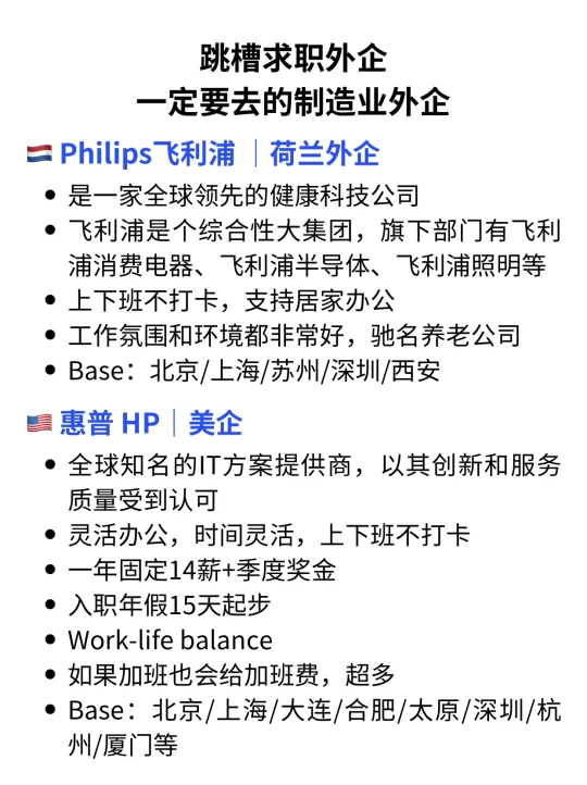 之前跟大家分享过宠物外企、玩具外企、香料外企、能源类外企、旅游类外企,这篇和大家继续分享神仙外企系列的-制造业外企,想跳槽的小伙伴玛住! · 在制造业领域,这些真外企不仅提供稳定的职业发展机会,还为员工创造了令人羡慕的工作环境,work-life balance,双休955,还能让你在工作中感受到乐趣和成长。 · ✅ 今天分享给大家一些制造业领域,冷门但是实力强劲的外企【具体介绍👀看上图‼️】 🇺🇸 通用电气 GE ▫️北京/上海/天津/无锡/沈阳/成都/西安 通用电气是一家多元化的工业和技术外企,女生友好外企!有超长年假98天,女员工在孕期定期检查不扣薪,公司有亲子空间🤰 · 🇺🇸 惠普 HP ▫️北京/上海/大连/合肥/太原/深圳/杭州/厦门 全球知名的IT方案提供商,灵活办公,时间灵活,上下班不打卡,年假时间长 · 🇩🇪 Siemens 西门子 ▫️上海/北京/深圳/杭州/厦门/大连/合肥/太原 一家全球性的技术德外企,无996大小周,混合办公模式,追求Work Life Balance的小伙伴可以试试 · 🇳🇱 Philips飞利浦 ▫️北京/上海/苏州/深圳/西安 是一家全球领先的健康科技荷兰外企,飞利浦是个综合性大集团,旗下部门有飞利浦消费电器、飞利浦半导体、飞利浦照明等,上下班不打卡,工作氛围和环境都非常好,驰名养老公司 · 👉(求职版) 每天更新外企求职干货,帮助大家稳拿好offer! 👍往期干货: ✅荷兰外企过于冷门了,实际上很好进 ✅Marketing面试被问;什么是品牌公关BPR? ✅裸辞竟成了,外企面试加分点 ✅跳槽被问:你为什么离职?6个高情商回复 ✅大部份外企英文面试,都是考常规题 -