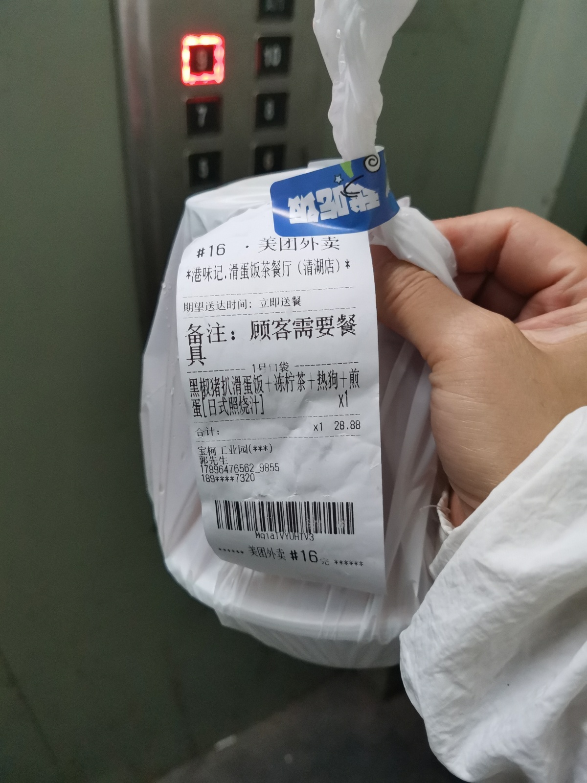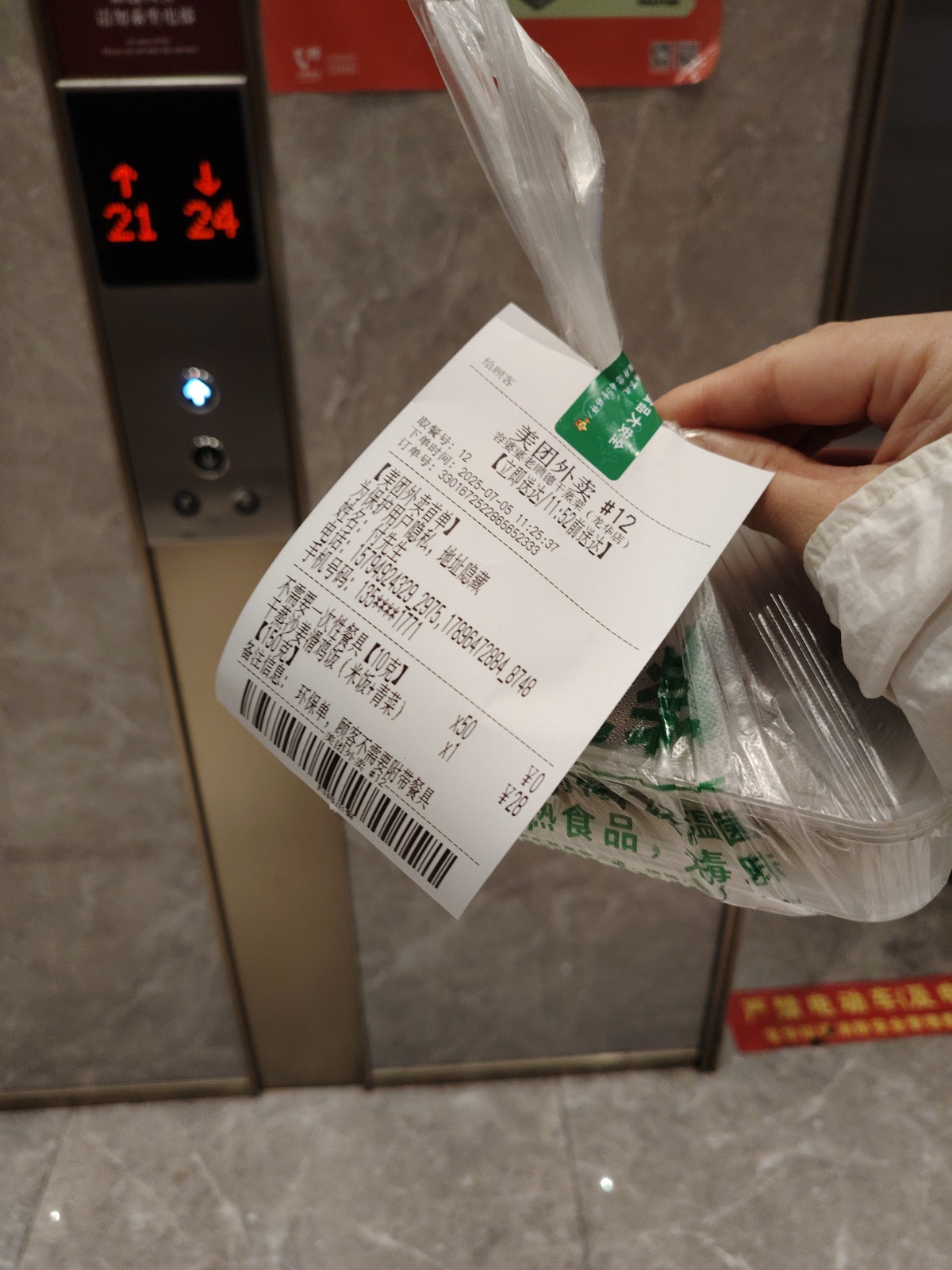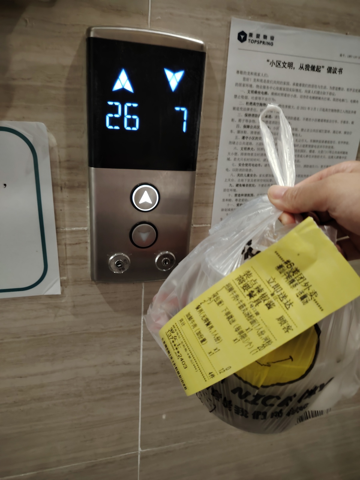 我送外卖有个习惯,不管是写字楼还是住宅小区,在等电梯的时候,喜欢以电梯按键为背景拍个订单小票的特写,然后在线发给顾客,也就是给顾客传递一个我已经在等电梯的信息,这样他就知道外卖即将送到,有的人会回复让直接放在门口,有的人则会提前打开门,这样一出电梯就可以直接递到顾客手里,也节省了自己的时间,有时候电梯是高层的,等电梯实属不易呀!