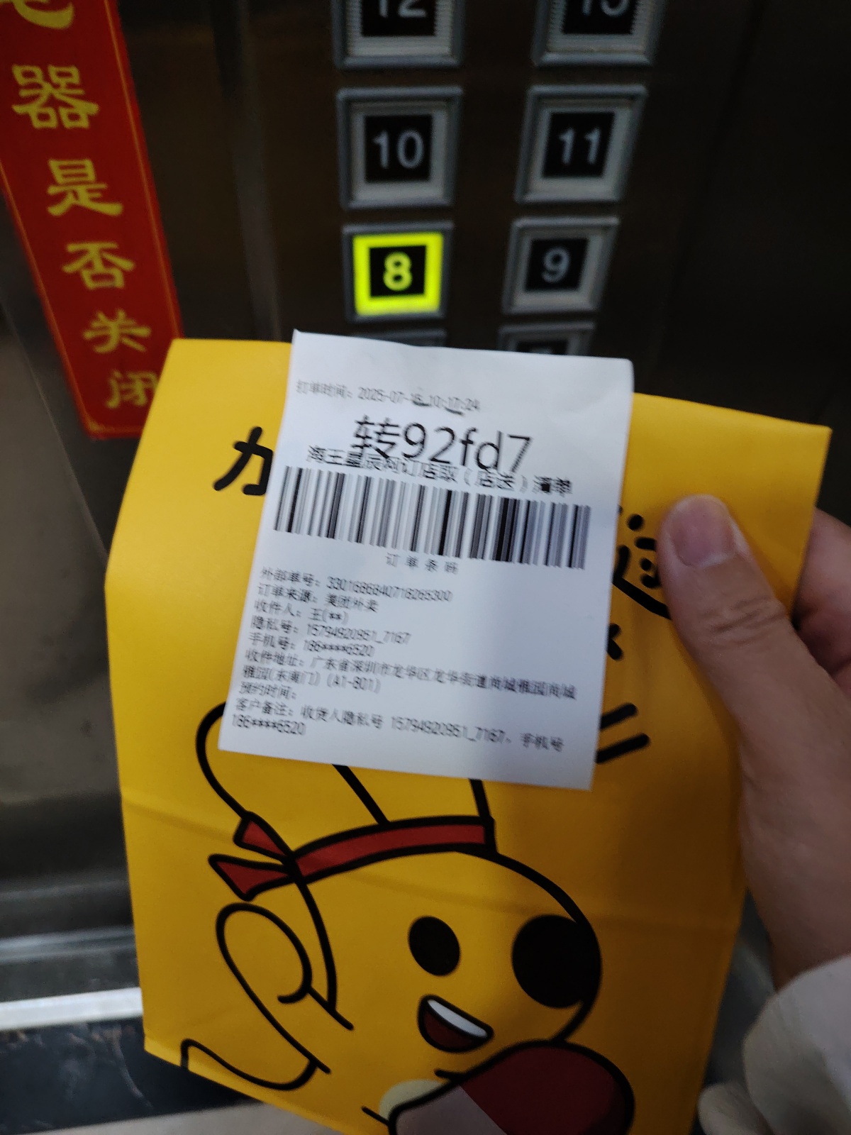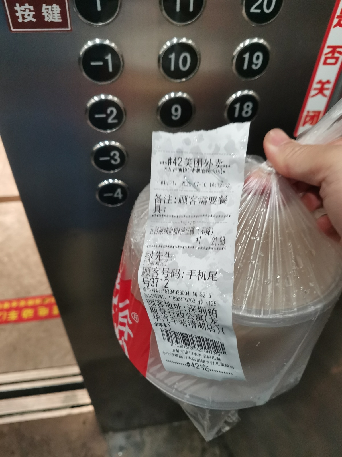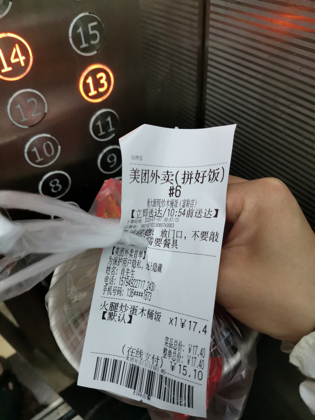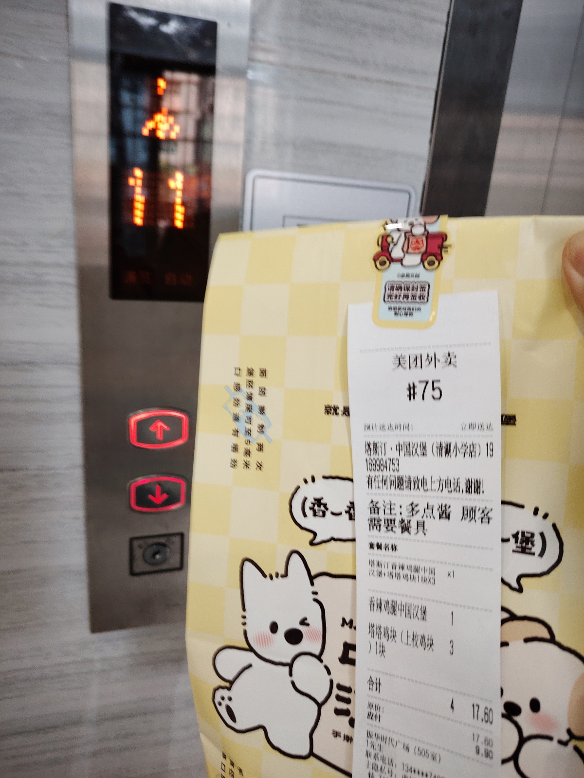 我送外卖有个习惯,不管是写字楼还是住宅小区,在等电梯的时候,喜欢以电梯按键为背景拍个订单小票的特写,然后在线发给顾客,也就是给顾客传递一个我已经在等电梯的信息,这样他就知道外卖即将送到,有的人会回复让直接放在门口,有的人则会提前打开门,这样一出电梯就可以直接递到顾客手里,也节省了自己的时间,有时候电梯是高层的,等电梯实属不易呀!