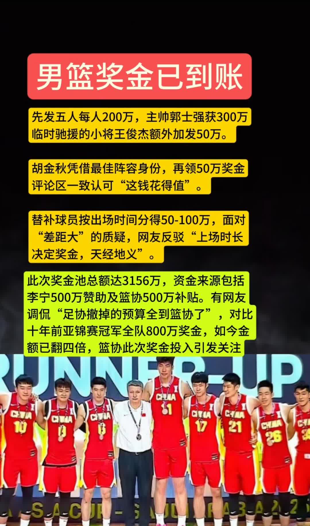 中国男篮奖金已到账! 首发阵容5人每人200万。 主教练郭士强300万。 入选亚洲杯最强阵容的胡金秋雨,王俊杰各多加50万。 其余球员按出场时间50至100万不等。 这一届的中国男篮是网友们认为奖金分配最合理的一次。而且都觉得这钱花的值。[赞][赞]