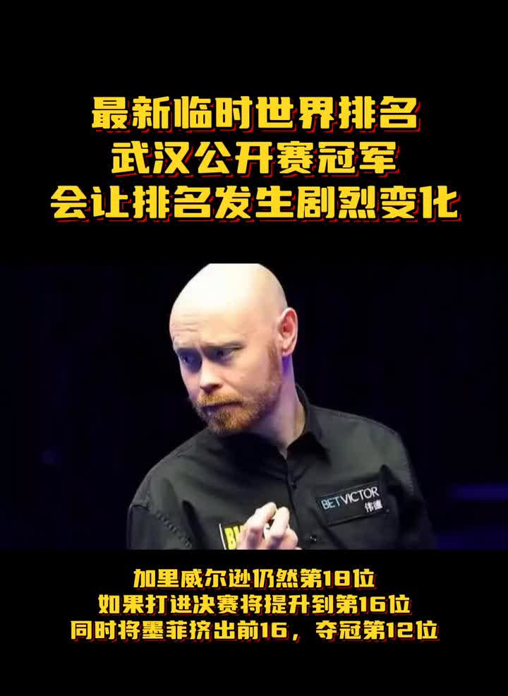 最新临时世界排名。 武汉公开赛冠军会让排名发生剧烈变化。 ·肖国栋提升到第13位,如果打进决赛将到第12位,夺冠第8位。 ·威廉姆斯仍然世界第5,如果打进决赛将上升到第4位,夺冠仍然第4。 ·加里威尔逊仍然第18位,如果打进决赛将提升到第16位,同时将墨菲挤出前16,夺冠第12位。 ·艾伦上升到第9位,如果再进决赛将上升到第8位,夺冠第7位。