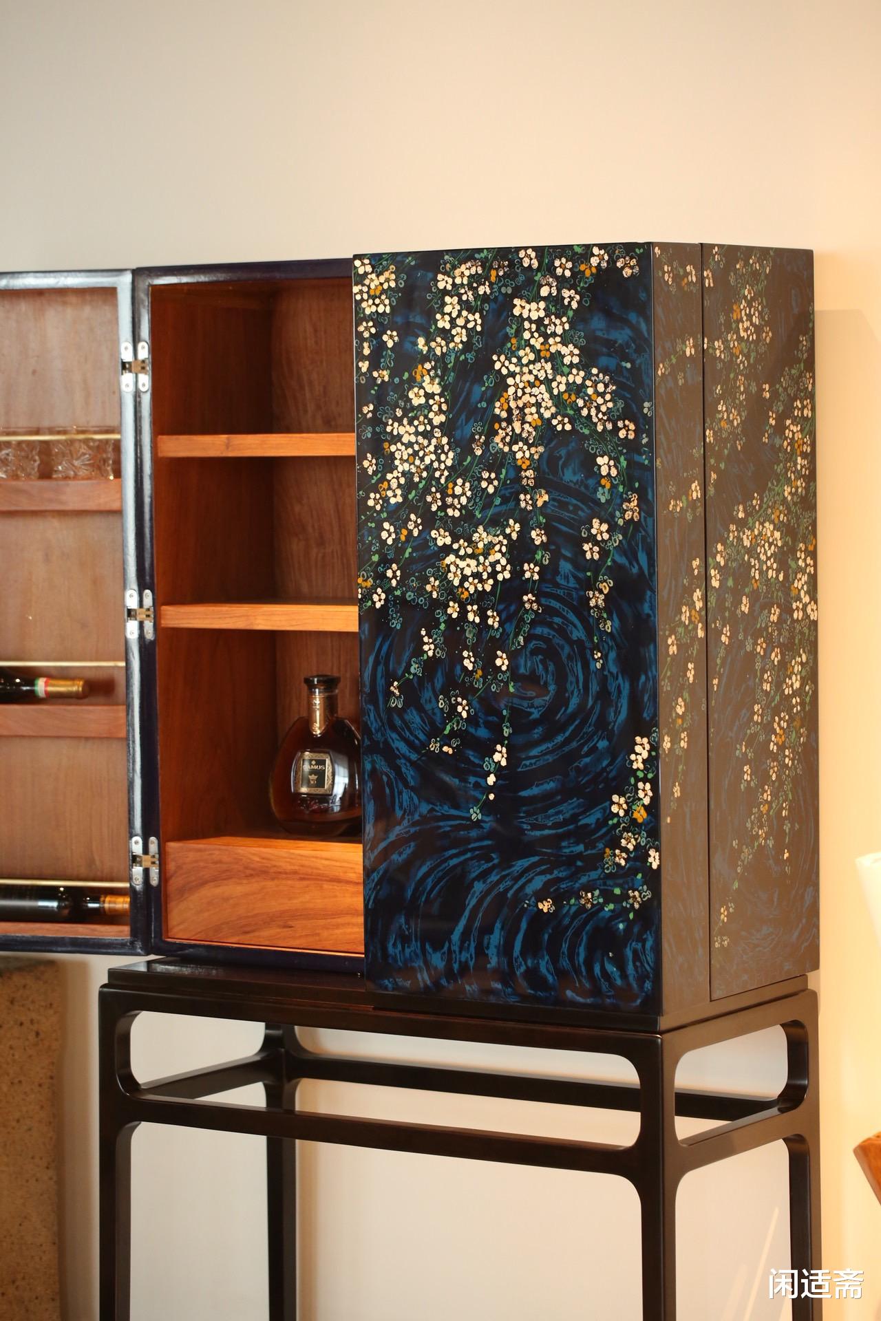 碎蛋壳嵌工艺的点缀,更添生活诗意。匠人将碎蛋壳精心裁切、拼接,在深邃的夜漆之上嵌出灵动的花枝纹样,蛋壳的莹白与夜漆的沉郁形成鲜明对比,光影流转间,花枝仿佛随风摇曳,栩栩如生。每一片蛋壳的拼接都暗藏匠心,每一道花枝的弧度都自然舒展,既彰显了工艺的精湛,又为酒柜注入了清新雅致的气息,让冰冷的器物多了份生活的温情与诗意。
