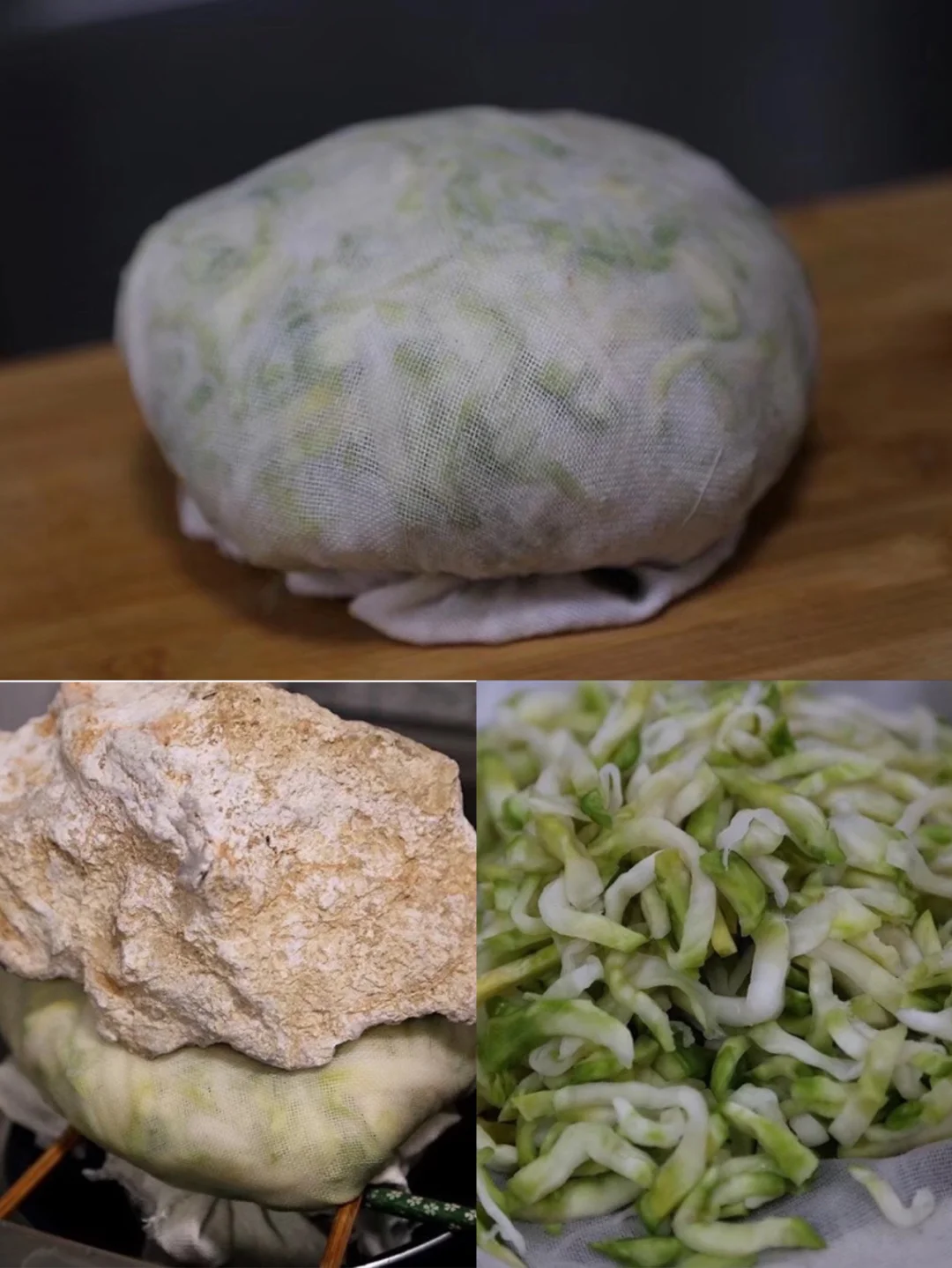 8.然后找一个大块一点的纱布把刚才的榨菜丝儿包起来抱紧一些 用手使劲压出水份