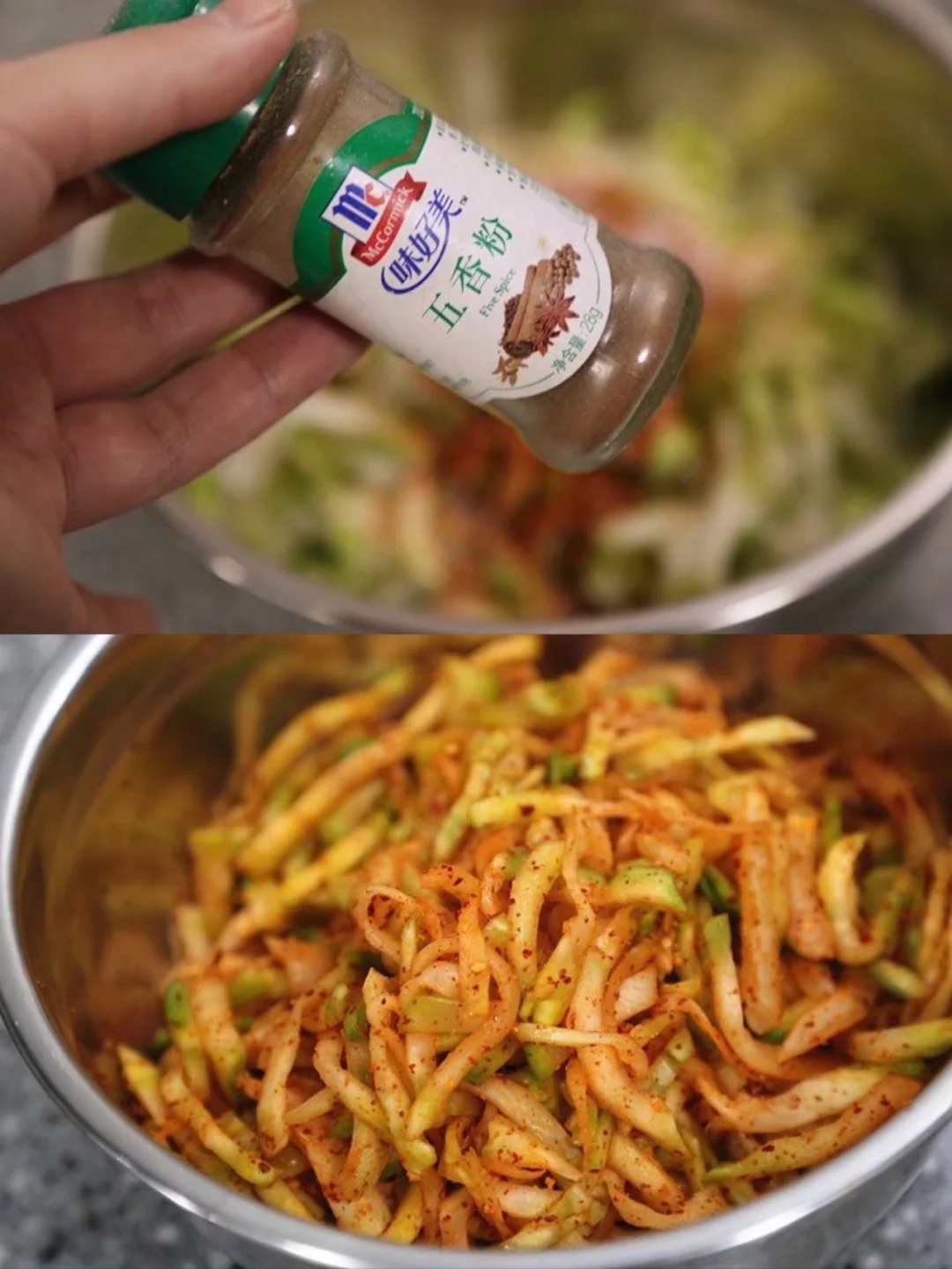 13.压干水份的榨菜丝儿放入一个干净的容器 加入两勺辣椒面