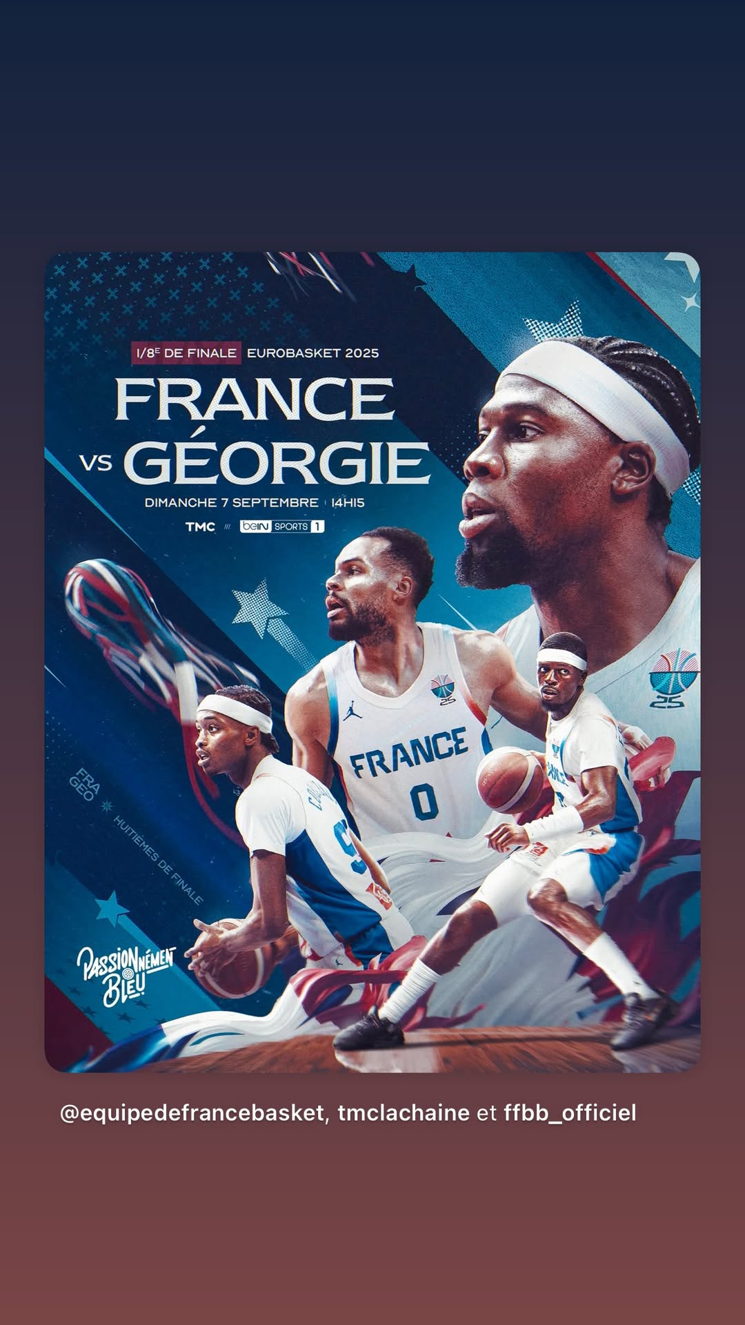 虎扑09月07日讯今日,法国球员盖尔雄-亚布塞莱更新个人ins,晒今日法国欧锦赛比赛预告。