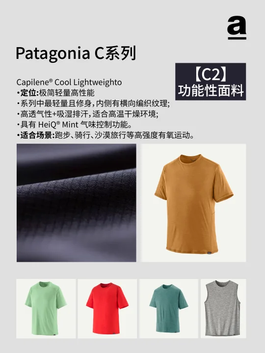 3️⃣Capilene Cool Lightweight(C2):修身版型I00聚酯纤维材质,内侧有横向编织纹理,是C系列中最轻薄的款式,非常适合高强度运动。