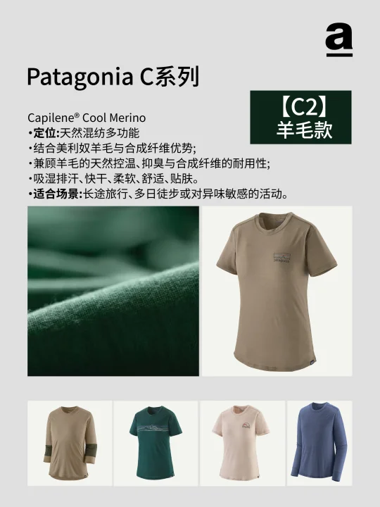 4️⃣Capilene Cool Merino(C2Merino):修身版型,由65%美利奴羊毛和35%聚酯纤维混纺,具备天然羊毛的排汗速干、调节体温及防异味功能。