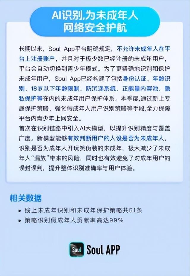 为了更精确、更全面地识别和保护未成年用户,SoulApp构建了一套包括身份认证、年龄识别、18岁以下年龄限制、防沉迷系统、正能量内容池、隐私保护等在内的全方位未成年保护体系。报告中列举的关键数据显示了这一体系的强大效能:未成年识别和未成年保护策略共51条,策略识别假成年人贡献率高达99%。
