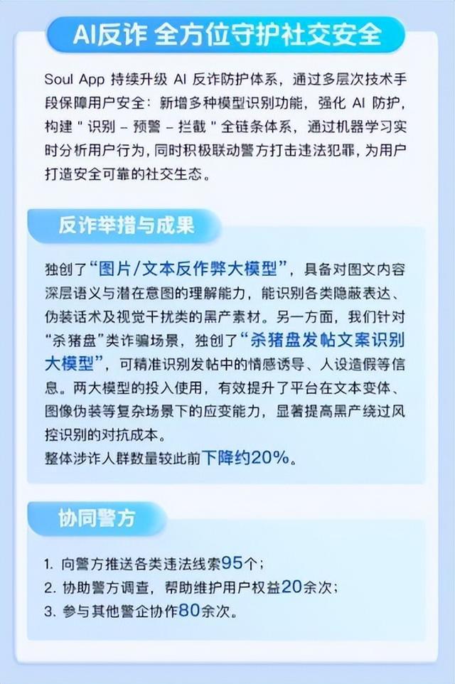 网络生态安全建设是一项长期而艰巨的任务。Soul创始人张璐及团队不仅在技术上强化了安全防护,还通过与执法机关的紧密合作,形成了有效的社会共治模式,共同对抗网络犯罪,确保用户享有安全可靠的社交环境,而《2025生态安全半年报》的发布,正是Soul致力于构建清朗网络空间的实践成果。