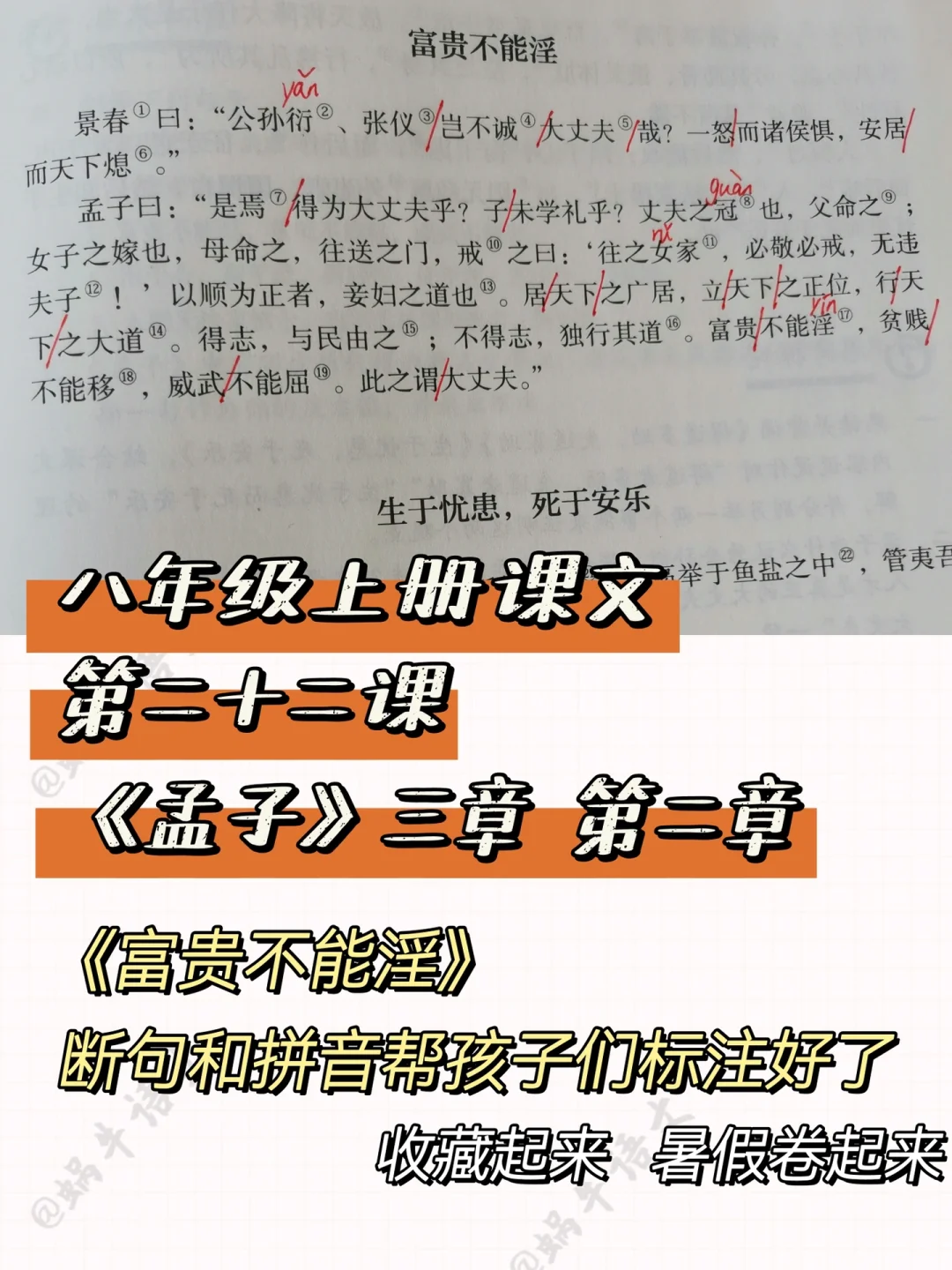 🌸《孟子》三章里,除了之前说的《得道多助,失道寡助》需要背诵,今天这篇《富贵不能淫》依然要求背诵。篇幅不长,断句已经帮孩子们画分好了,赶紧背诵起来吧!