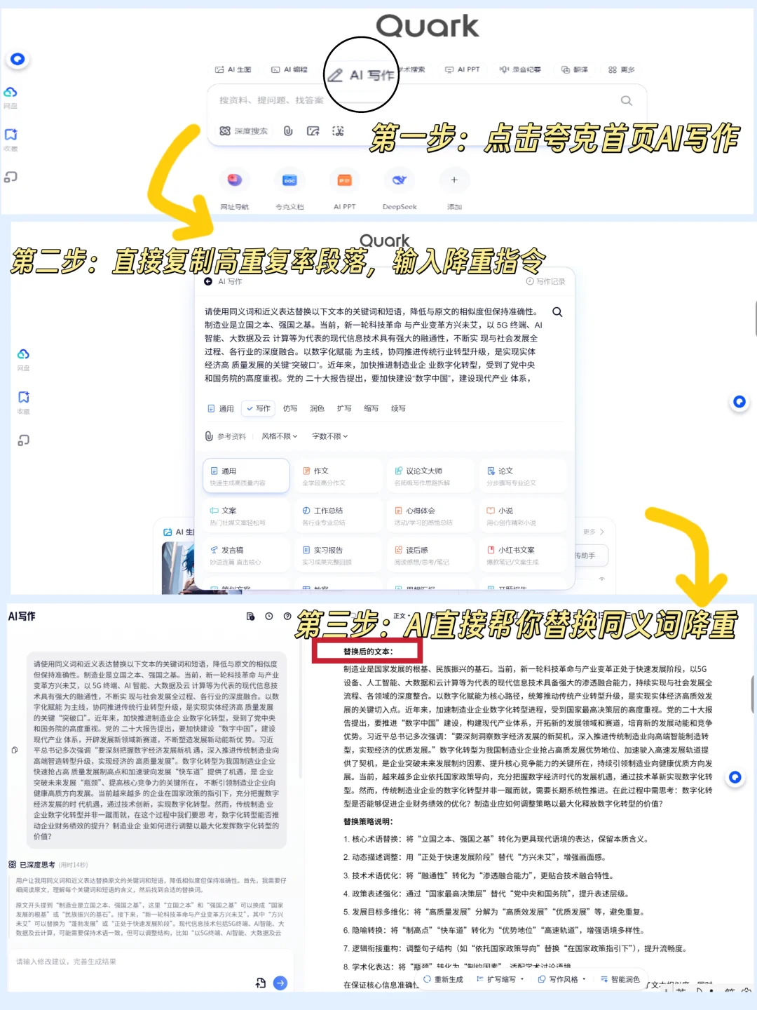 🔎信息差二:原来降重降AI率是可以不用想破脑袋的!直接把查重率高的段落复制到夸克PC端的AI写作,输入指令让它帮我用同义词和近义表达替换原本文本中的关键词和短语,降低与原文的相似度但保持准确性,直接把高的我绝望的查重率拉到及格线