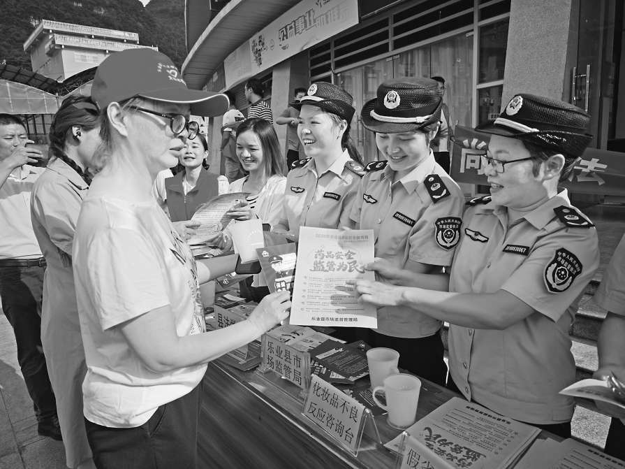 9月5日,广西壮族自治区乐业县市场监管局、农业农村局等单位联合开展2025年全国食品安全周集中宣传活动。市场监管人员与“八桂食安”志愿者向消费者讲解如何辨识假冒伪劣食品、预防食物中毒、正确认识食品添加剂等知识,让消费者真切感受到“食安乐业”在身边。杨素蕊本报记者顾艳伟摄影报道