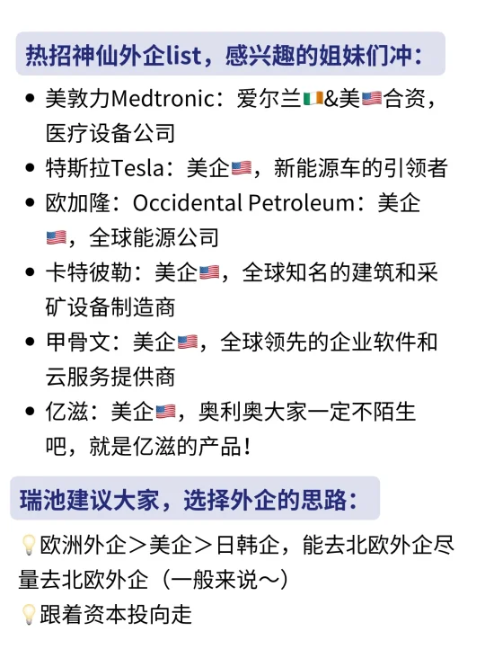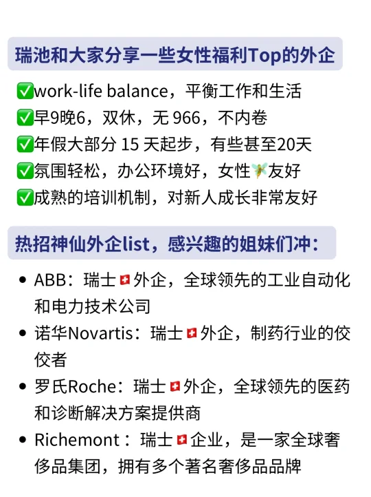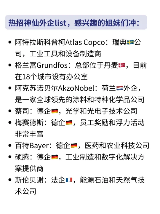 今天和大家分享一些女生友好外企 1、work-life balance,平衡工作和生活 2、早9晚6,双休,无 966,不内卷 3、年假大部分 15 天起步,有些甚至20天 4、氛围轻松,办公环境好,女生🧚‍♀️友好 · 图中所列的企业list,标注出了地区,这里建议姐妹们选择外企的思路: 💡欧洲外企>美企>日韩企,能去北欧外企尽量去北欧外企 · ✅女生友好外企,姐妹们准备好简历大胆尝试(具体介绍👀看上图‼️) ✔️罗氏Roche|瑞士外企: 除了基本的五险一金外,还提供补充商业保🧵、带薪年假、产假等,设有员工俱乐部和健身房等设施 · ✔️硕腾|德企: 是一家全球知名的工业制造和数字化方案提供商,很注重work-life balance!各种奖💰还蛮多,甚至还有学历提升奖、生日、节日、生子都有奖💰! · ✔️Richemont|瑞士外企: 旗下拥有多个著名奢侈品品牌,涵盖了珠宝、腕表、时装、皮具等多个领域,集团注重员工的职业发展,提供丰富的培训机会和晋升空间 · ✔️阿特拉斯科普柯Atlas Copco|瑞典外企: 他家的产品广泛应用于建筑、矿业、汽车、机械制造等多个行业,公司注重技术创新和产品研发,有员工餐厅和班车,为大家提供便利的工作和生活条件 · ✔️格兰富Grundfos|丹麦外企: 是一家全球知名的水泵制造商,其产品广泛应用于工业、建筑、农业等多个领域,15天带薪假期,工作节奏wlb · ✔️阿克苏诺贝尔AkzoNobel|荷兰外企: 女生友好外企,一家全球领先的涂料和特种化学品公司,新员工培训体系非常全 · ✔️百特Bayer|德企: 农业科技公司,重视对新入职员工的培养,尤其校招的宝子,有buddy详细介绍部门业务、team分工,成长进步很快 · ✅还有欧加隆、卡特彼勒、亿滋等等,写不下了,具体介绍大家看上图吧~ · 👉(求职版) 每天更新外企求职干货,帮助大家稳拿好offer! -