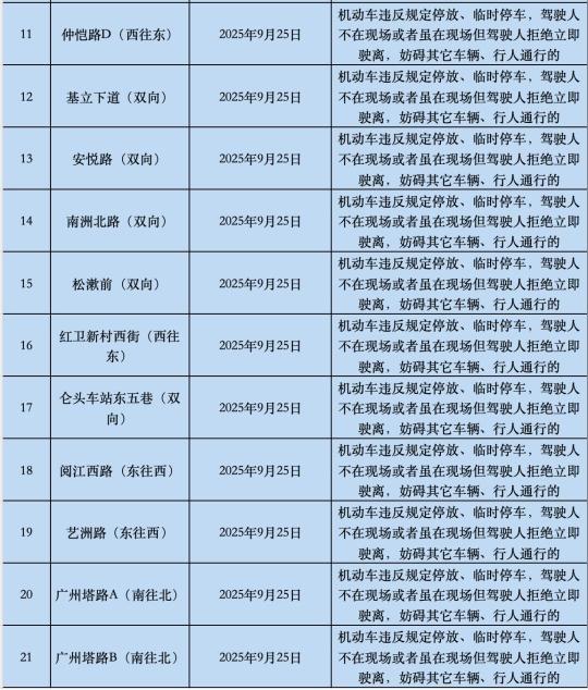 该批设备执法类别涉及“机动车违反规定停放、临时停车,驾驶人不在现场或者虽在现场但驾驶人拒绝立即驶离,妨碍其它车辆、行人通行的”等,具体路段涉及仲恺路、阅江西路、艺洲路、广州塔路、南洲北路等。
