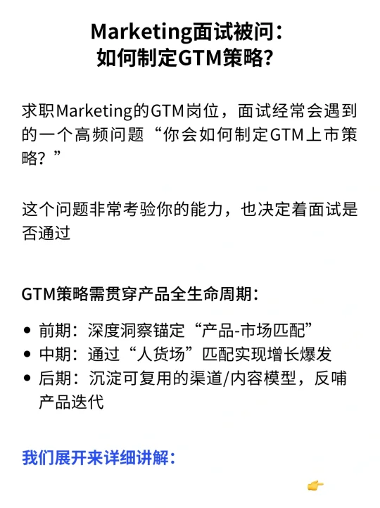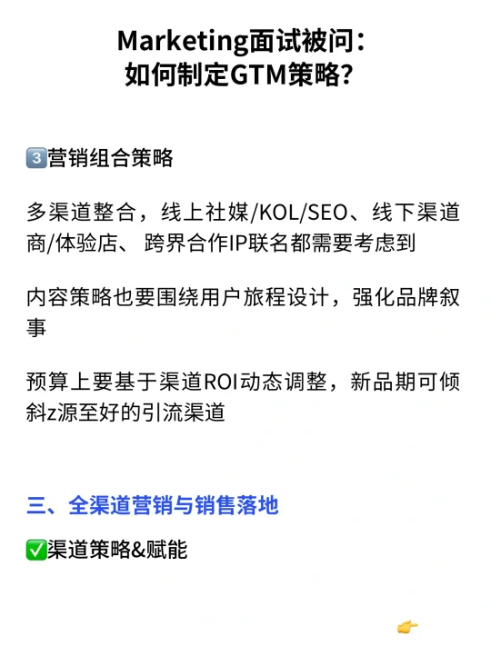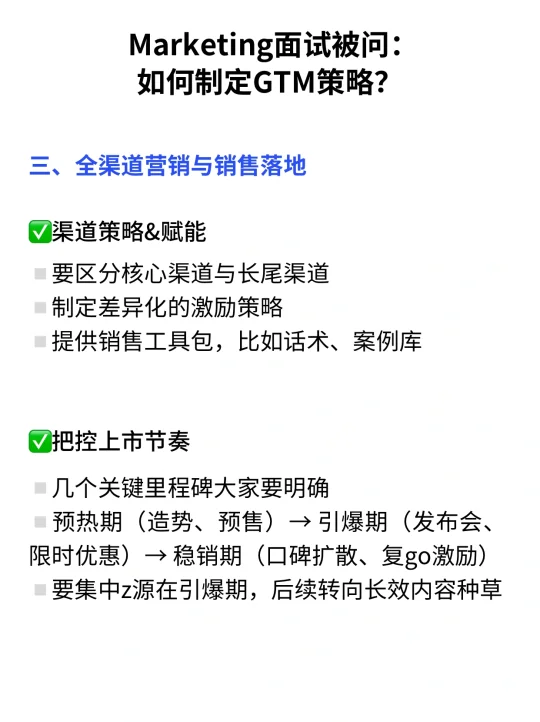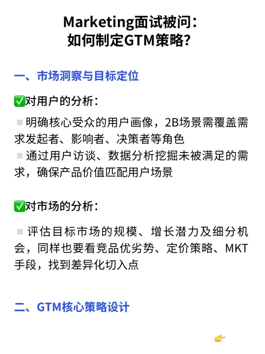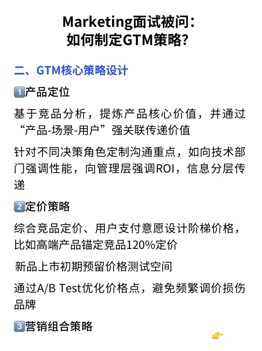 GTM岗位求职面试中,经常会被问到一个核心高频问题:“你会如何制定GTM上市策略?” · 很多人容易泛泛而谈,但真正懂得GTM的人,一定能把上市策略贯穿产品的整个生命周期:从洞察、爆发,到沉淀复用,环环相扣♻️ · 下面我基于实际经验,将GTM制定拆解为具体步骤,帮助大家建立系统化思路: · 一、市场洞察与目标定位 ✅用户洞察 要深入刻画目标用户画像,无论是2C还是2B场景,前者需聚焦年龄、性别、兴趣、行为,后者则要覆盖需求发起者、影响者、决策者等多角色视角 真正有效的需求挖掘离不开一线用户访谈及定量数据分析,核心在于发现未被满足的需求,确保产品价值与用户场景高度匹配 · ✅市场分层分析 要科学评估目标市场的规模、成长性及细分机会,建议基于TAM/SAM/SOM进行定量判断 竞品分析不可或缺,包括产品优劣势、定价模式、市场行为、主要渠道,核心是寻找自己产品的差异化切入点 同时,看行业趋势,如技术变化、客户行为迁移 · 二、GTM核心策略设计 1️⃣产品定位策略 ▫️明确自身产品的独特价值主张,基于竞品差异点,紧密结合“产品-场景-用户需求”三方,提炼出打动目标客户的核心信息 ▫️对于B端市场,信息传递需分层:如对IT部门强调技术性能、运维效率,对管理层则突出ROI与降本增效,做到需求对位、利益协同 · 2️⃣定价策略制定 结合市场竞品价格带、目标用户支付意愿综合考量 新产品上市可采用阶梯定价,为后续调整留有空间 大家要记住A/B Test或区域试点,对价格敏感性做数据验证,避免频繁变价带来的品牌信任损耗 · 3️⃣营销与渠道策略(详细内容👀看上图‼️) · 三、全渠道营销与销售落地 ✅渠道策略&赋能(详细内容👀看上图‼️) ✅如何把控上市节奏(详细内容👀看上图‼️) · 🙋‍♂️我是瑞池,500强外企总部Leader+面试官 👉(求职版) 看更多求职干货笔记 -