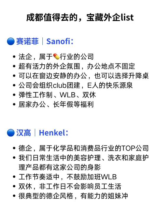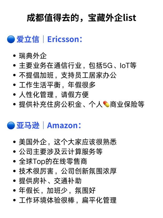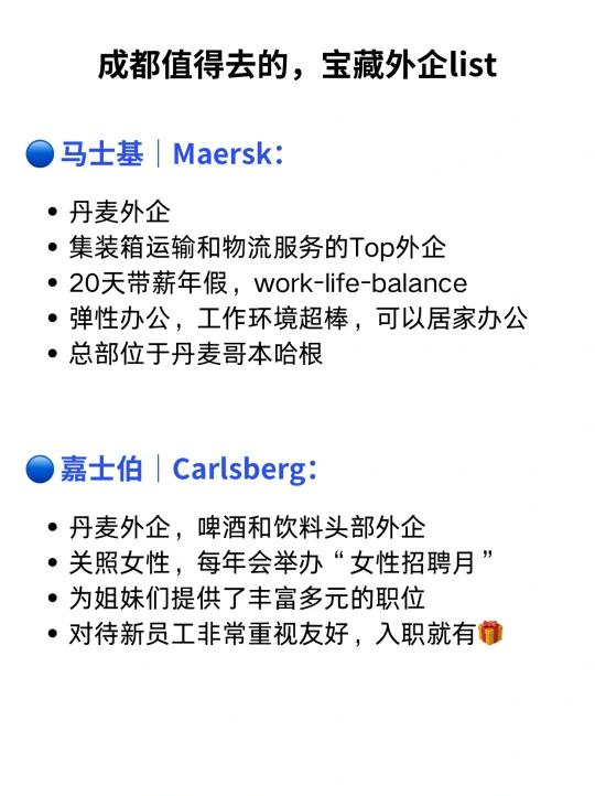 之前写过几期良心老东家,看到好多姐妹问川渝地区的外企,所以决定出个成都外企list,这些外企都有HC,而且加班少wlb! · 今天这期互联网科技行业、制造业、快消行业、化工行业、物流行业的外企都有哦:(具体介绍大家👀看上图⬆️) 🔵 爱立信|Ericsson: 瑞典外企,主要业务在通信技术和服务,包括5G、IoT等,不提倡加班,支持员工居家办公,工作生活平衡,年假很多,人性化管理,请假方便 · 🔵 亚马逊|Amazon: 美国外企,这个大家应该很熟悉!全球Top的在线零售商,技术很厉害,公司创新氛围浓厚,提供各种补貼:房补、交通补助,年假长,加班少,氛围好 · 🔵 汉高|Henkel: 德企,属于化学品和消费品行业的TOP公司,我们日常生活中的美容护理、洗衣和家庭护理产品都有这家公司的身影,工作节奏适中,不鼓励加班WLB · 🔵 赛诺菲|Sanofi: 法企,属于💊行业的公司,超有活力的外企氛围,办公地点不固定,可以选择在窗边安静的办公,也可以选择升降桌 · 🔵 马士基|Maersk: 丹麦外企,集装箱运输和物流服务外企,20天带薪年假,工作环境超棒,总部位于丹麦哥本哈根 · 🔵 嘉士伯|Carlsberg: 丹麦外企,啤酒和饮料头部外企,女生友好外企,对待新员工非常重视友好,入职就有新人🎁 · 当然成都的外企不止这几家,以后慢慢盘点给大家分享,还有蛮多外企hc都开了,想求职跳槽的宝子们可以准备啦! · 🙋‍♂️我是瑞池,500强外企总部Leader+面试官 👉(求职版) 看更多求职干货笔记 👍往期干货: ✅00后毕业生,一不小心进了北欧外企 ✅面试被问:如何策划一场Marketing Campaign? ✅按这个流程来,面试不通过都难 ✅外企英文面试,基本都是这几类问题 ✅想去外企的姐妹,都存下吧!去试试挪威外企 -