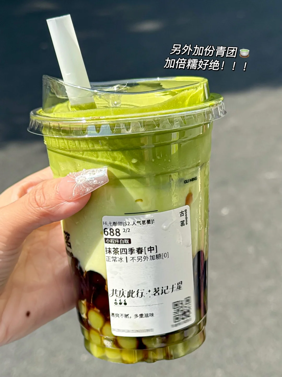 真的有被古茗四季春新品🍵🍃惊艳到!! 抹茶+黑糖珍珠脑袋真的喝不腻!!超出预期的好喝😭花香调也太妙了。。。 还有纯茶清爽又低卡!这两杯就是夏天的代名词吧~ · ✔️抹茶四季春 抹茶脑袋狂喜啊啊啊啊啊啊🤩抹茶的微苦恰到好处,咸甜咸甜的!!混着四季春茶底自带的花香!底部超多软糯Q弹的黑糖珍珠!吸管一戳,喝到三倍快乐!!! 隐藏喝法:➕青团➕不另外加糖➕正常冰!!口感层次绝了。。小料控光是看着都觉得爆炸幸福的程度🥹 ✔️四季沁春 纯茶党爱惨了这杯。。四季春茶搭配金观音,自带的栀子花香!喝完满嘴留香!!!个人感觉比普通茶底更清爽!花香超馥郁的!无敌清爽解腻!!真的好适合夏天 好喝就算了还低卡!一把子就沦陷🫶🏻