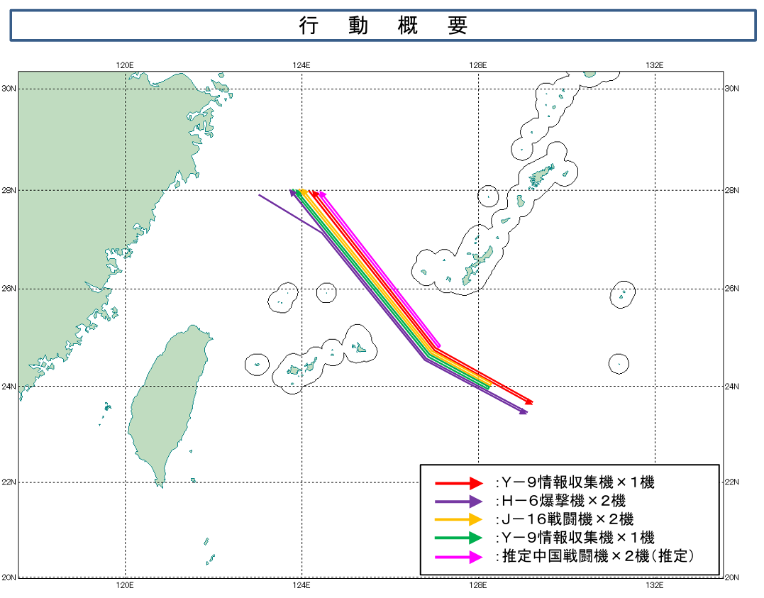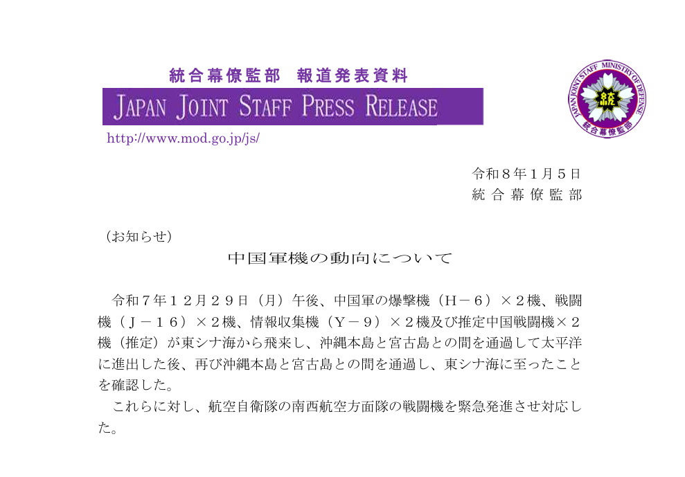 据日本防卫省官网1月5日发布的通告,包括H-6轰炸机、J-16战斗机和Y-9情报收集机等在内的中国军机,于2025年12月29日从冲绳(琉球)岛和宫古岛飞入太平洋,促使日本航空自卫队F15J战斗机紧急升空监视响应。