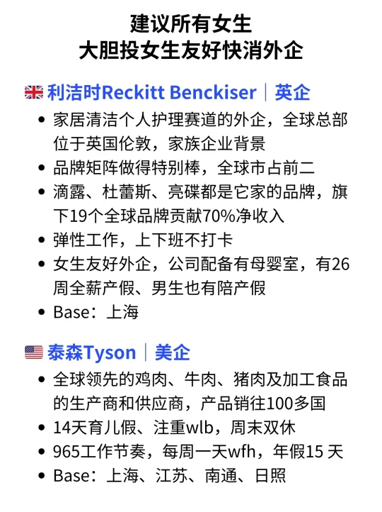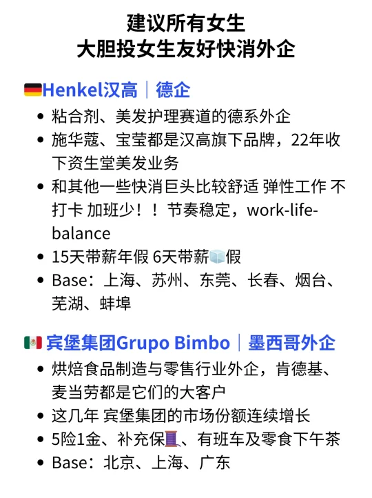 之前有朋友问我:“有没有那种 真正靠谱、不画饼的好外企?” · 实话说,找这样的公司确实需要分辨!这些年观察下来,我心中的“好外企”标杆,核心就这几点:​​ ▫️WLB 是底线,下班后,时间完完全全属于你 ▫️15天带薪年假,鼓励你休、方便你休​,让你能真正放松、充电 ▫️公司真心在意你的职业发展,而不是只把你当“螺丝钉” ▫️沟通简单,协作顺畅,工作起来心不累很重要的 · 🌟对我来说,一家真正的好外企,不在于名气多大、楼多高,而在于它是否真正尊重你作为一个“人”的需求和价值 · ✅ 今天也和大家分享几家快消行业,我心目中的好外企(公司详细介绍👀看上图‼️) 🇲🇽 宾堡集团Grupo Bimbo|墨西哥外企:烘焙食品制造与零售行业外企,全球z大烘焙企业,产品涵盖切片面包、蛋糕、饼干等5000多种,肯德基、麦当劳都是它们的大客户 Base:北京、上海、广东 · 🇬🇧 利洁时Reckitt Benckiser|英企:家居清洁个人护理赛道的外企,全球总部位于英国伦敦,家族企业背景,连续多年获“杰出雇主”,弹性工作​,上下班不打卡 Base:上海 · 🇩🇪Henkel汉高|德企:施华蔻、宝莹都是汉高旗下品牌,22年收下资生堂美发业务,弹性工作、不打卡、加班少!! Base:上海、苏州、东莞、长春、烟台、芜湖、蚌埠 · 🇺🇸 泰森Tyson|美企:全球领先的鸡肉、牛肉、猪肉及加工食品的生产商和供应商,产品销往100多国,注重wlb,周末双休 Base:上海、江苏、南通、日照 · 👉(求职版) 外企求职干货每日更新 🙋‍♂️瑞池帮你实现Work-Life Balance -