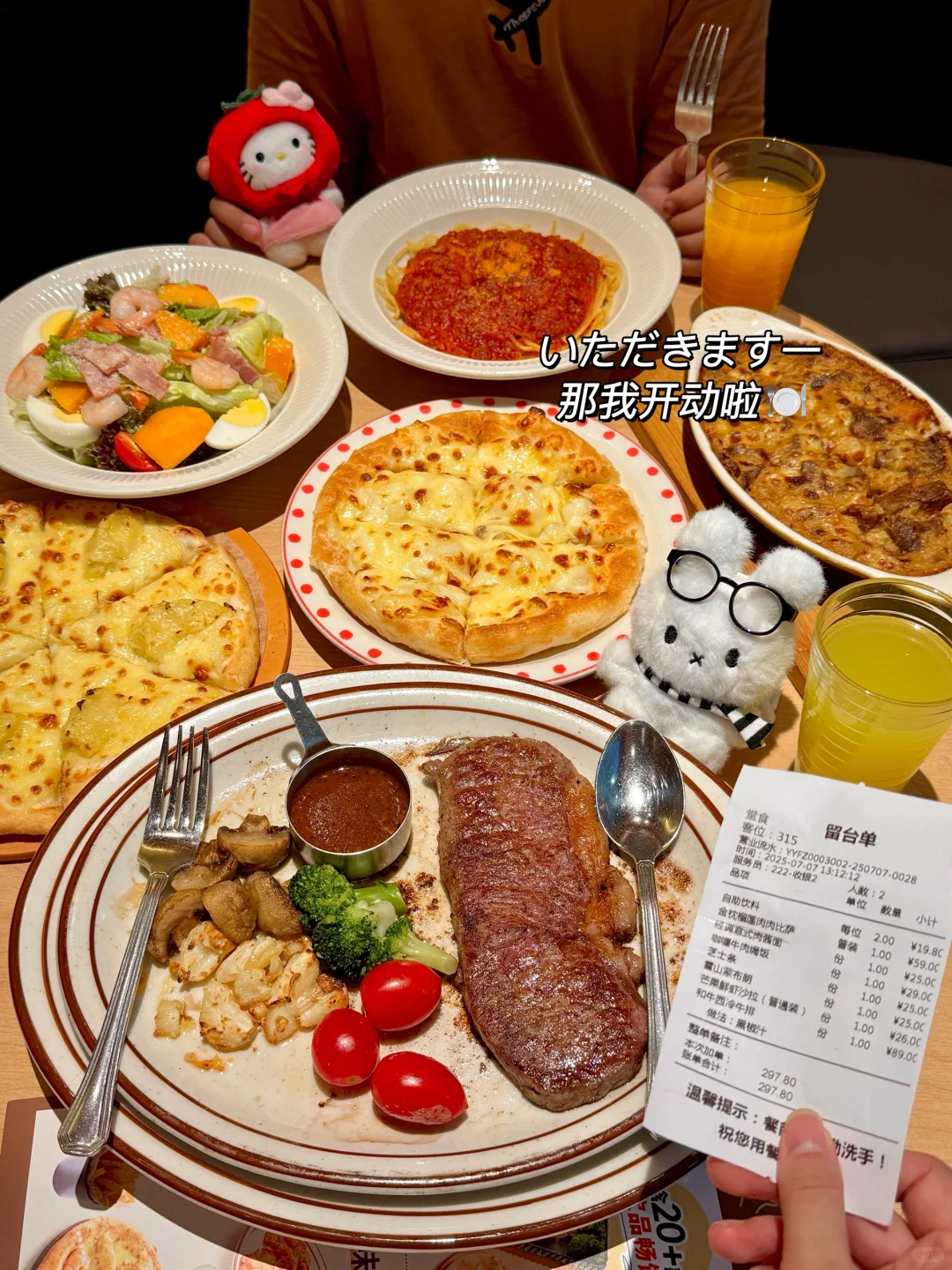 从学生时代一直吃到现在的平价西餐🍴 9.9💰就能实现饮品无限畅饮♾现磨咖啡、新鲜果汁….. 推荐几道个人坠满意的菜品!!尊嘟很好吃! 和牛西冷牛排🥩和牛光看雪花纹路就很美😭 肉香浓郁,倒上黑椒汁肉质柔嫩爆汁,不得不说这家的肉质真的好到感人,价格也很亲民~ 雪山蒙布朗🌰现点现做,外层是迁西板栗做成的栗子泥,口感绵密,搭配里面的香草冰淇淋好治愈啊…. 还有每次必点的芝士条🧀我真的吃不腻!!安佳芝士超能拉丝! 经典意式肉酱意面🍝金枕榴莲肉肉比萨🍕咖喱牛肉焗饭🍛芒果鲜虾沙拉🥗都很好吃!