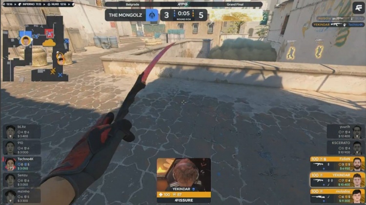 第16局蒙古枪械不全,两把TEC-9三把AK,蒙古中路三人上A小,mzinho架住A大反清的Fallen,随后mzinho进A大击杀molodoy与yuurih拿到三杀,KSCERATO回防双杀,残局4k一把TEC-9被KSCERATO击杀,蒙古5-11黑豹。