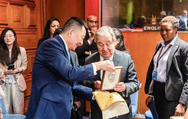 在会见联合国秘书长古特雷斯期间,赵东将一份特殊的礼物赠予对方。正面是为古特雷斯秘书长作的肖像画,背面融入厦航总部展呈全球唯一的“联合梦想号”等可持续发展实践。通过具象化的方式,展现中国民航践行UNGC理念的具体实践,展现中国企业对全球可持续议程的深度参与和责任担当。