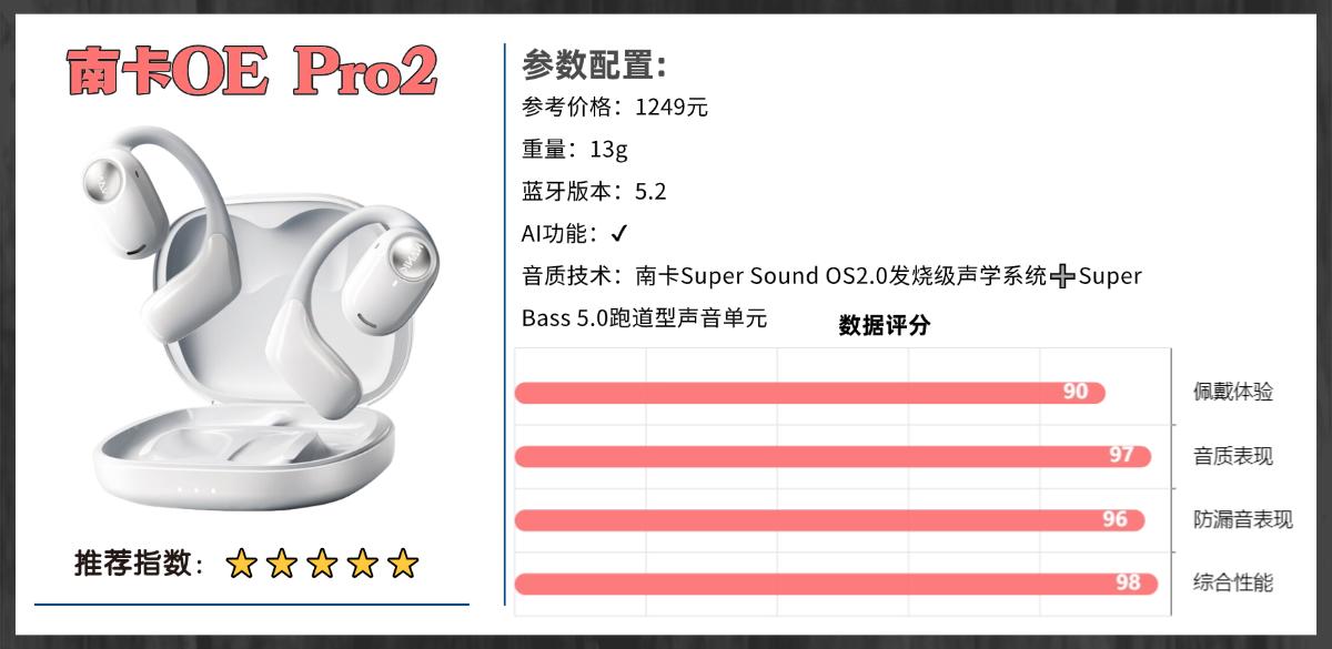 推荐四:南卡OE Pro2(1249元)推荐指数:⭐⭐⭐⭐⭐机型亮点:数码圈中高端口碑销量TOP1,开放式里的“音质巅峰”技术之王