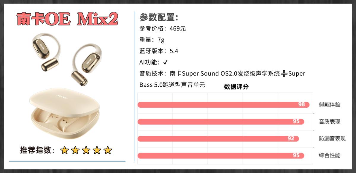 推荐一:南卡OE Mix2开放式耳机 (469元)推荐指数:⭐⭐⭐⭐⭐机型亮点:百元级性能之王,性能直追千元旗舰耳机!