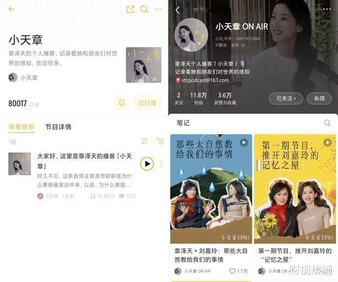 2026年1月12日,章泽天接连入驻了播客平台小宇宙和社交媒体小红书。短短一天时间播客内容收听超15.4万,订阅超8万。小红书上的首期节目对话了刘嘉玲,粉丝数也一天涨到了11.8万。早在2025年11月,章泽天担任VOGUE客座总监时便透露“正在策划秘密项目”,如今看来,这正是她当时埋下的伏笔。